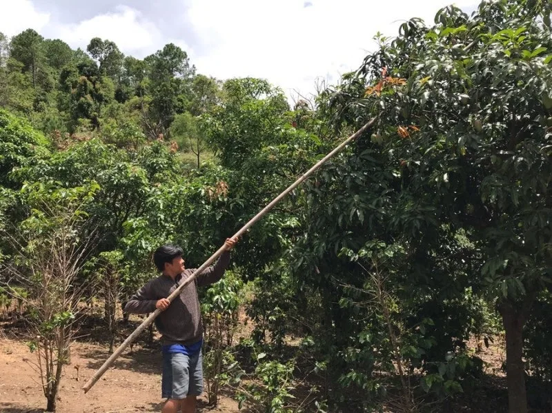 가이드가 망고 나무 밑에 있던 긴 대나무를 집어 망고를 따서 건네주어 먹어 보니 망고가 정말 맛있다.
