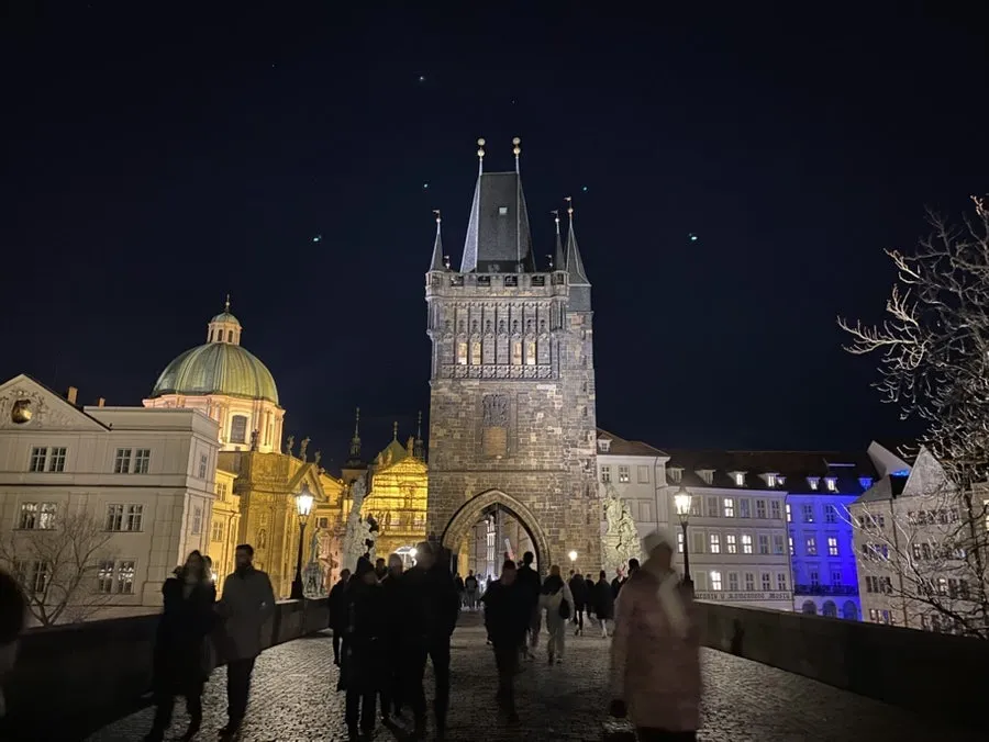 다리 위에는 많은 관광객이 오가고 있었고, 다리 너머로 프라하의 야경을 볼 수 있었다.