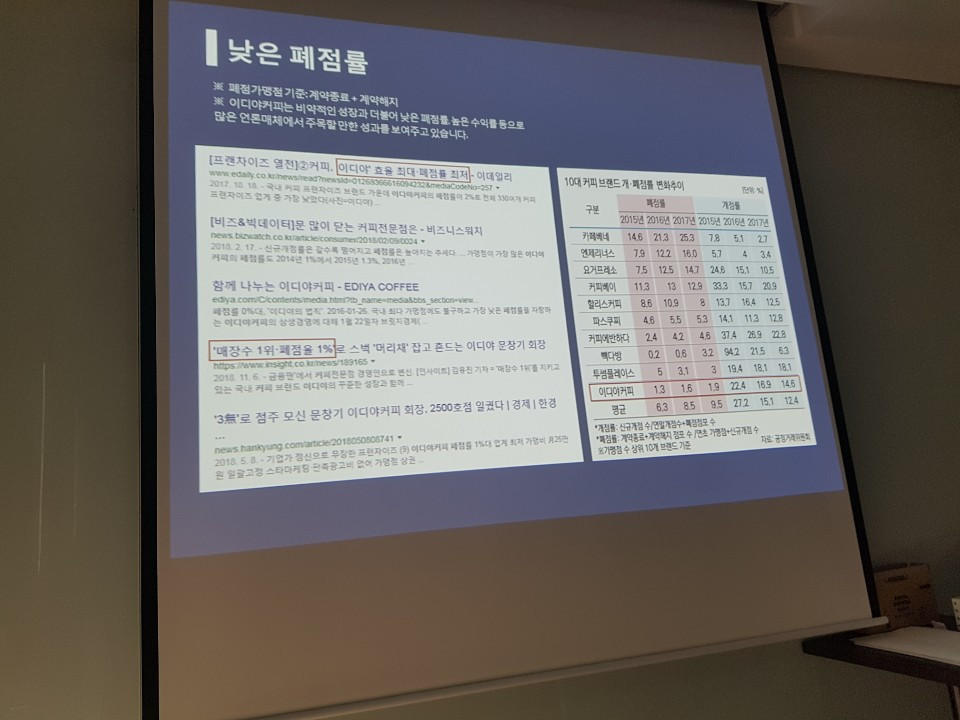 낮은 폐점률, 이디야에서 가장 자부심을 가지는 부분이다. 폐점률이 1% 자리다. 옆의 개점률과 같이 봤을 때 얼추 15개 오픈을 하면 2개는 망하는 것이다. 이 폐점률에 궁금한 것이 생겨 질문을 했었다. '다른 사람에게 양도를 할 경우 폐점률에 표기가 안 되는 건가요?' 라고 물어보니 그렇다고 답한다. 즉 양도양수는 전혀 들어가지 않는 지표이다.