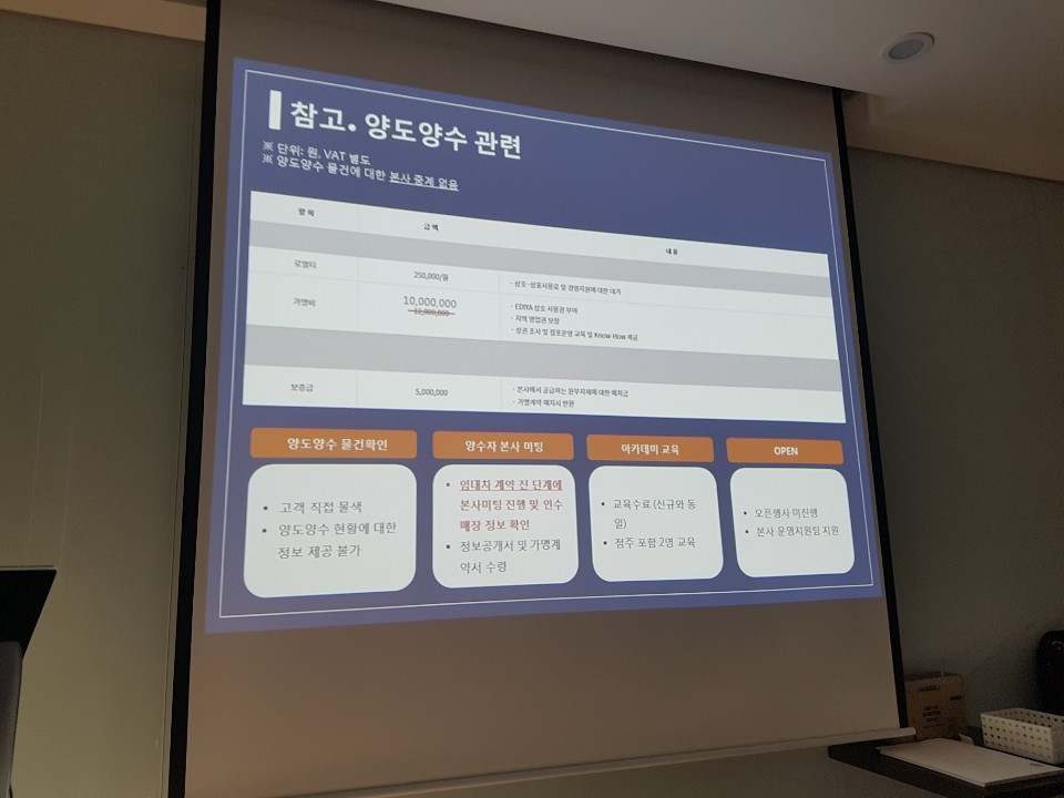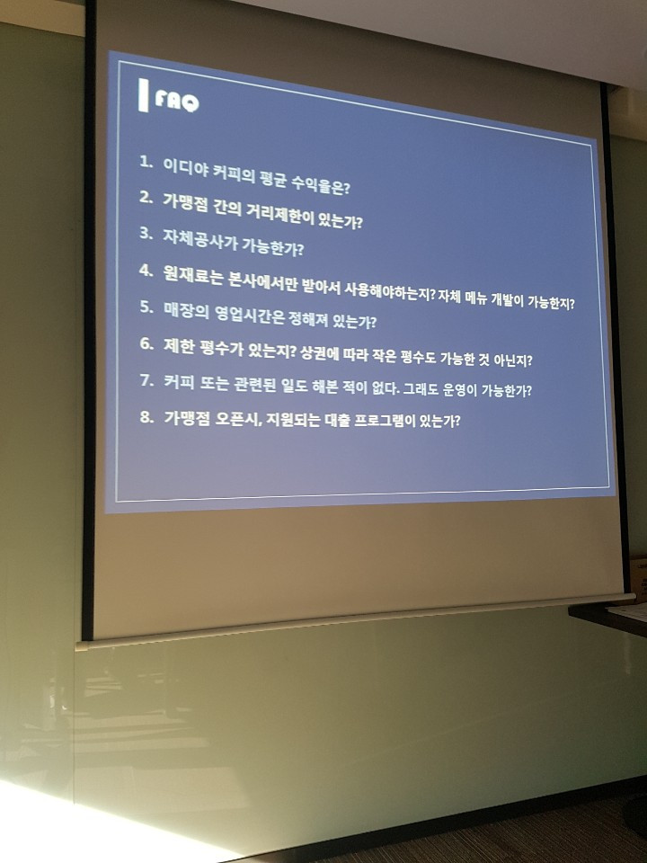가맹로열티: 이디야는 가맹 로열티가 월 25만원이다. 잘 되도 안 되도 25만원이다. 여기서 혹하지 말아야 할 부분은 내가 한 달 수입이 -500만원이여도 로열티는 25만원이고, 한 달 수입이 500만원이여도 25만원이라는 사실이다. 분명 적은 금액이라고 생각할 수 있지만, 장사가 안되는 곳은 타격이 클 것이다. 개인적인 생각으로 로열티를 이익의 퍼센트가 아니라는 것은 '장사가 되지 않아도 우리는 책임을 지지 않겠다.'는 의지의 표현 같았다.