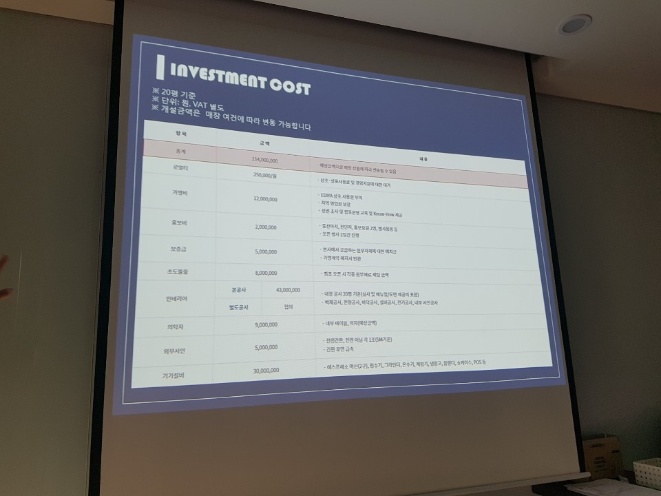 대부분의 사람들이 가장 먼저 궁금해 할 창업 비용이다. 지금 현재 이디야는 2700개의 매장이 있다고 한다. 그래서 이제는 20평 이상의 매장만 가맹점을 내준다고 한다. 20평 기준으로 대략 이디야에만 1억2천(VAT 별도) 정도가 들어간다. 당연 이 금액에는 권리금, 보증금, 월세 제외다.