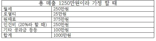 서울의 가구가 어느 정도 있는 곳일 경우, 20평대 1층 동네상권은 약 200~300만원 필요할 것이다.(지역에 따라 차이가 너무 크므로... 참고사항이다.) 250~300만원의 중간인 250만원으로 월세를 가정해보자. 총 매출 대비 20%를 250만원이라 할 때, 총 매출은 1250만원이다.