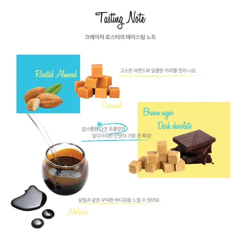 옆에 있는 사진이 '크레이저 커피 몰'에서 가지고 온 '해머' 블랜드의 테이스팅 노트다. 어떤 원두가 블랜드 되어 있는지는 표기되어 있지 않았다. 테이스팅 노트를 이미지로 딱 보일 수 있게 만들어놔서 좋았다.