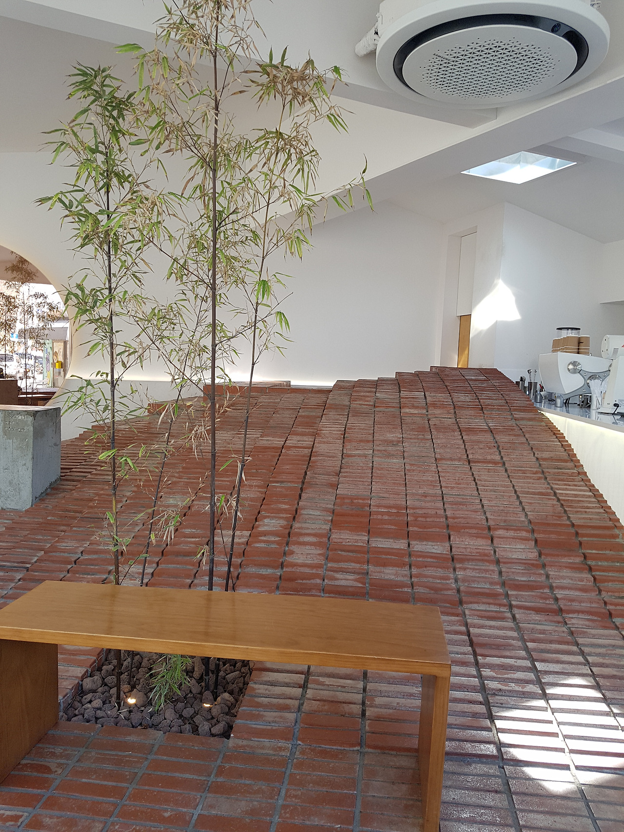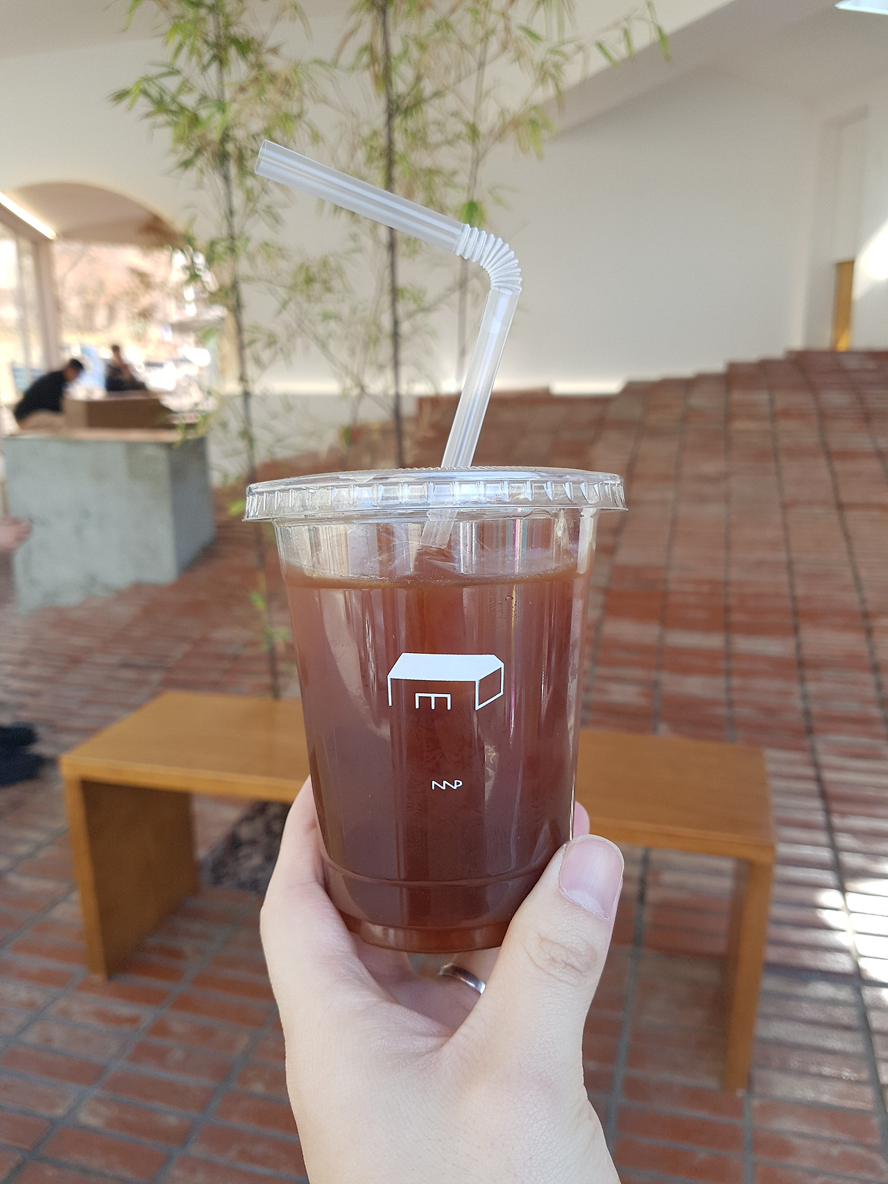 이 카페의 매력 포인트라고 하면 우리가 아는 규격화된 테이블이 없는 것으로 꼽을 수 있다. 이런 인테리어는 미국의 로컬 카페를 연상시키면서 일본적인 느낌도 섞여있다. 사진 앞에 보이는 대나무 같은 나무 때문이지 않을까 싶다.