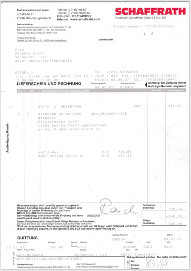 다시 일주일 뒤에 집주인으로부터 연락이 왔다. 집주인은 보험회사로부터 200유로를 지급받기로 했다고 말했다. 그는 보험회사로부터 받은 이메일을 전달해 주었는데, 거기에는 그가 보험회사에 제출한 영수증이 첨부되어 있었다. 자세히 살펴보니 영수증은 무려 2007년에 발급된 것이었고 소파 가격은 700유로였다(원래 가격이 948유로인 소파를 할인된 가격인 700유로에 구입했다).