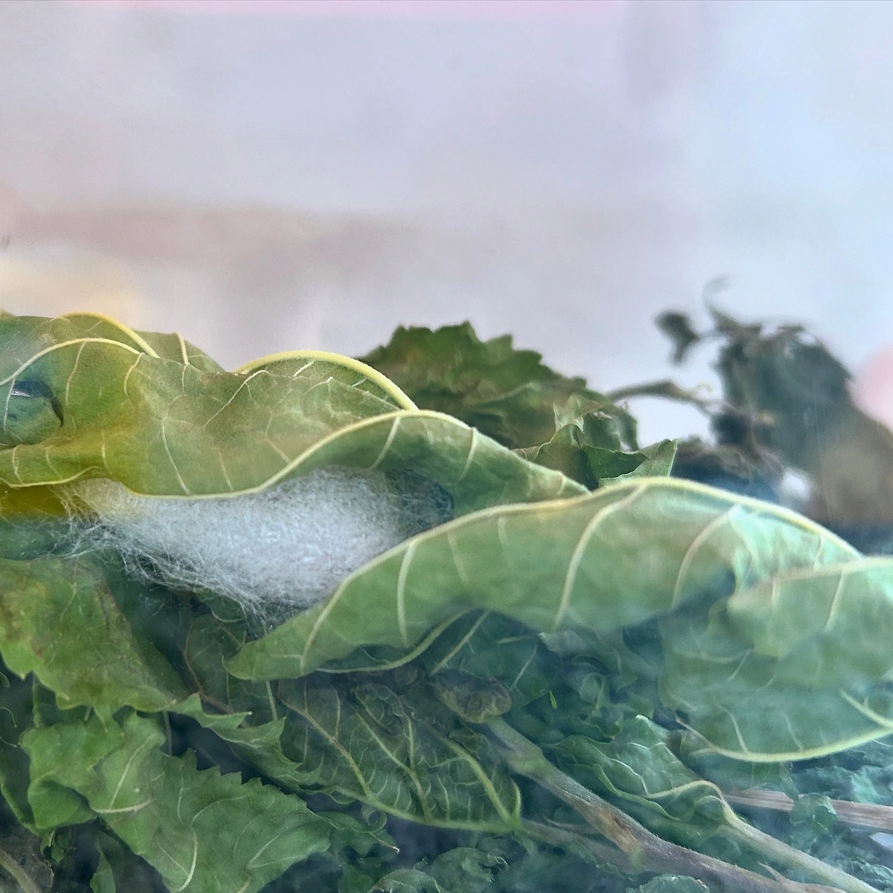 먼저 만들어진 고치가 있는 쪽에는 더 만들 자리도 더 없는데 혼자서 뚝 떨어져 다른 쪽 모서리에다가 고치를 만드려나. 초조한 하루를 세 번 보낸 후, 누에가 보이지 않고 고치도 세 개뿐이어서 무척 놀랐다. 조심스레 채집통을 돌려보니 뽕잎사이에 고치 하나가 만들어져 있었다. 이불을 덮고 누운 것 같다. 막내 누에가 먹다가 잠이 들었을까, 무슨 꿈을 꾸고 있을까. 먹다가 하얀 고치가 되었다 생각하니 구름 속에 사는 신선이야기 같다.