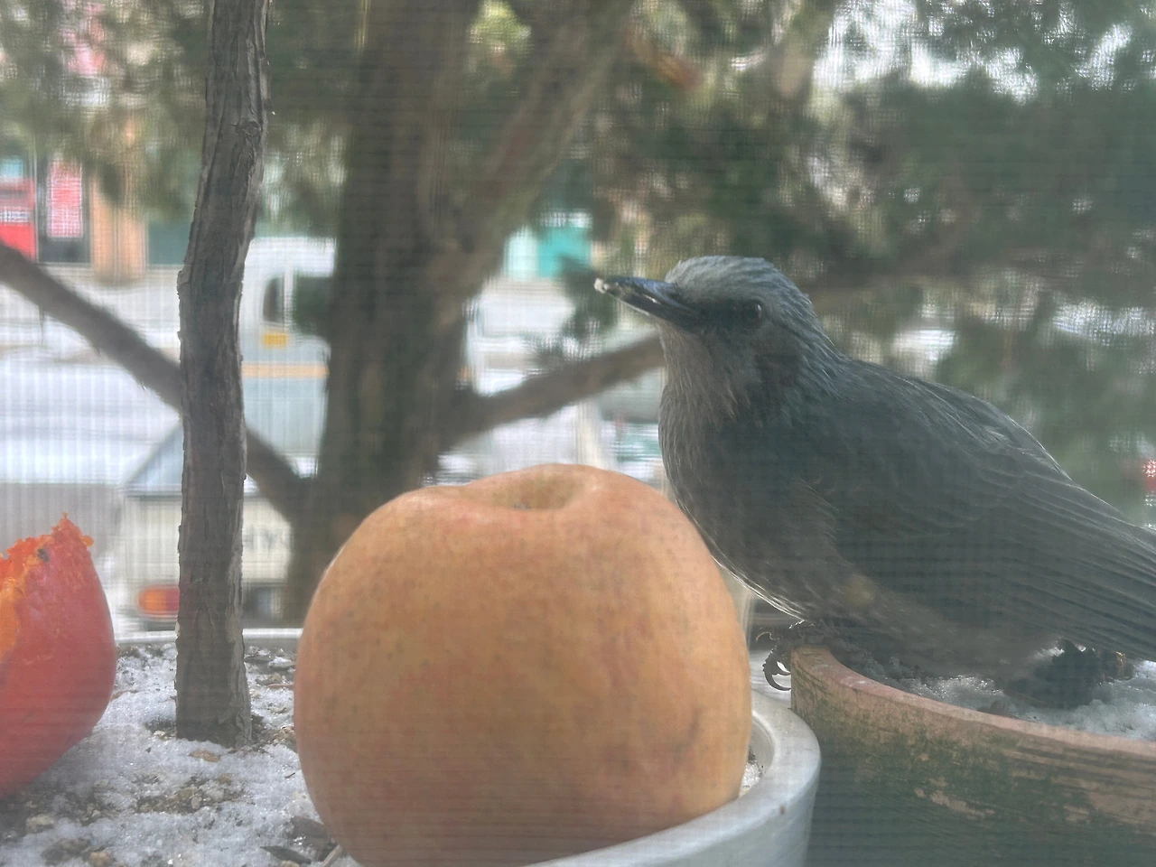 서운한 마음도 잠시, (나 혼자 내적 친밀감이 깊어졌던 모양) 잘 먹는 존재들은 모두 귀여우니까 사과도 하나 놓아주었다. 사과를 좋아하는지 슬쩍 다가가서 사진을 찍는데도 날아가지 않고 계속 먹었다. 그렇게 직박구리들이 먹은 대봉감이 여섯 알, 사과는 두 알이 되자, 창문을 열어놓고 청소기를 돌리는데도 도망가지 않고 나를 보고 짹짹거렸다. 혹시 인사? 신뢰 관계(?)가 형성된 듯하여 뿌듯하기까지 했다.