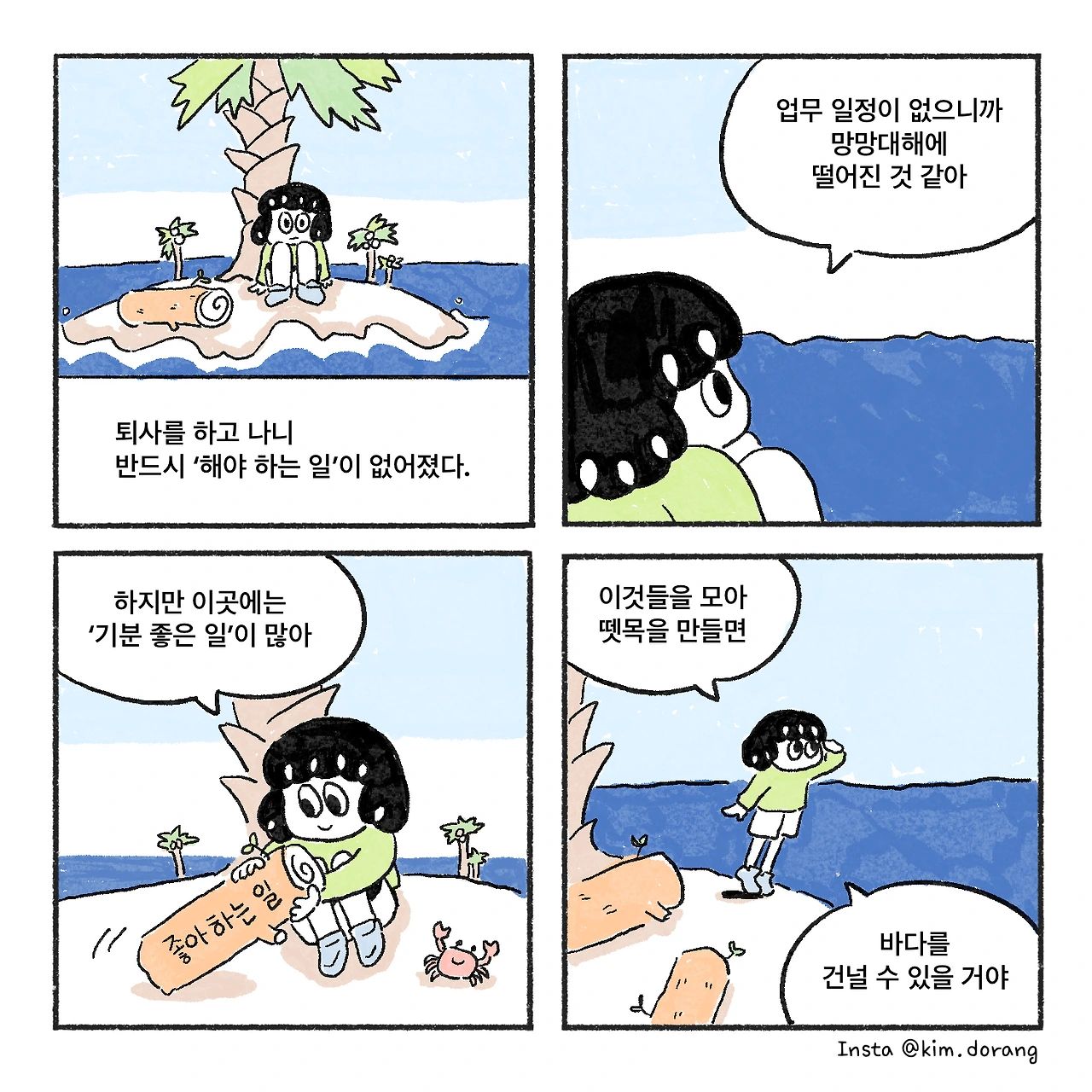 그 와중에도 새롭게 발견하는 것이 있긴 했습니다. 시간에 쫓기던 때는 귀찮아했던 바디로션 바르기, 설거지, 분리수거가 재미있게 느껴졌습니다. 원대하고 포부가 넘치는 ‘하고 싶은 일’은 보이지 않았지만, 기분이 좋아지는 작은 일들이 계속 늘어갔습니다. 세상은 여전히 끝없는 수평선처럼 막막했지만, 기분 좋은 작은 일들이 쌓이면 뗏목이라도 만들어 볼 수 있을 것 같았습니다. 혹시 아나요? 이 뗏목이 저를 바다 너머로 보내줄지도 모르잖아요.