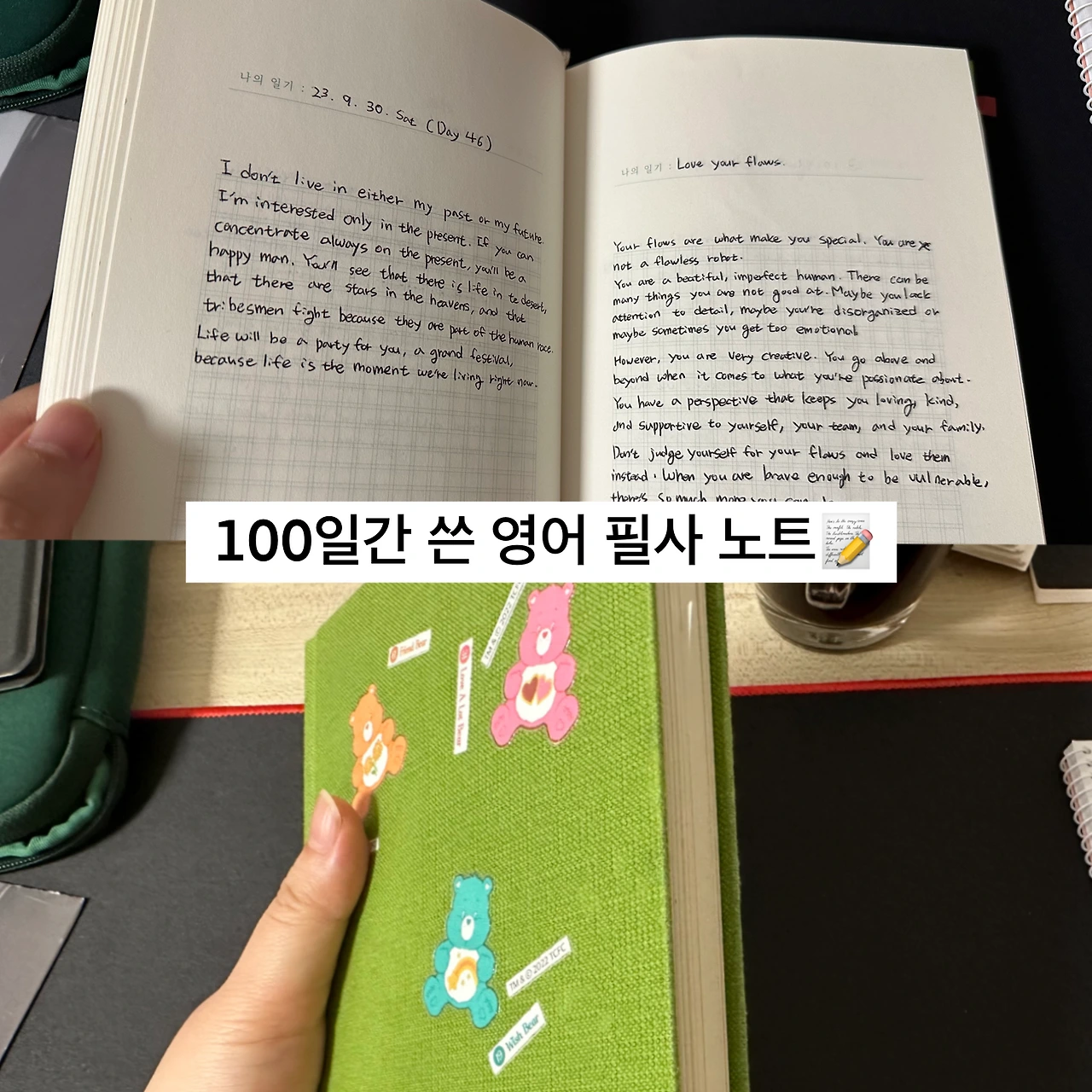 그런데 ‘뻔한 메시지’가 손을 움직여 종이에 잉크를 배이게 하는 행위를 거치자 ‘감동적인 메시지’로 변했습니다. 신기한 일이죠. 아침마다, 때론 늦은 밤에 한 글자씩 적는 긍정적인 메시지가 손과 눈을 거쳐 깊숙이 들어왔습니다.