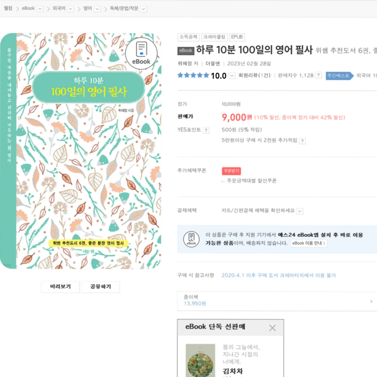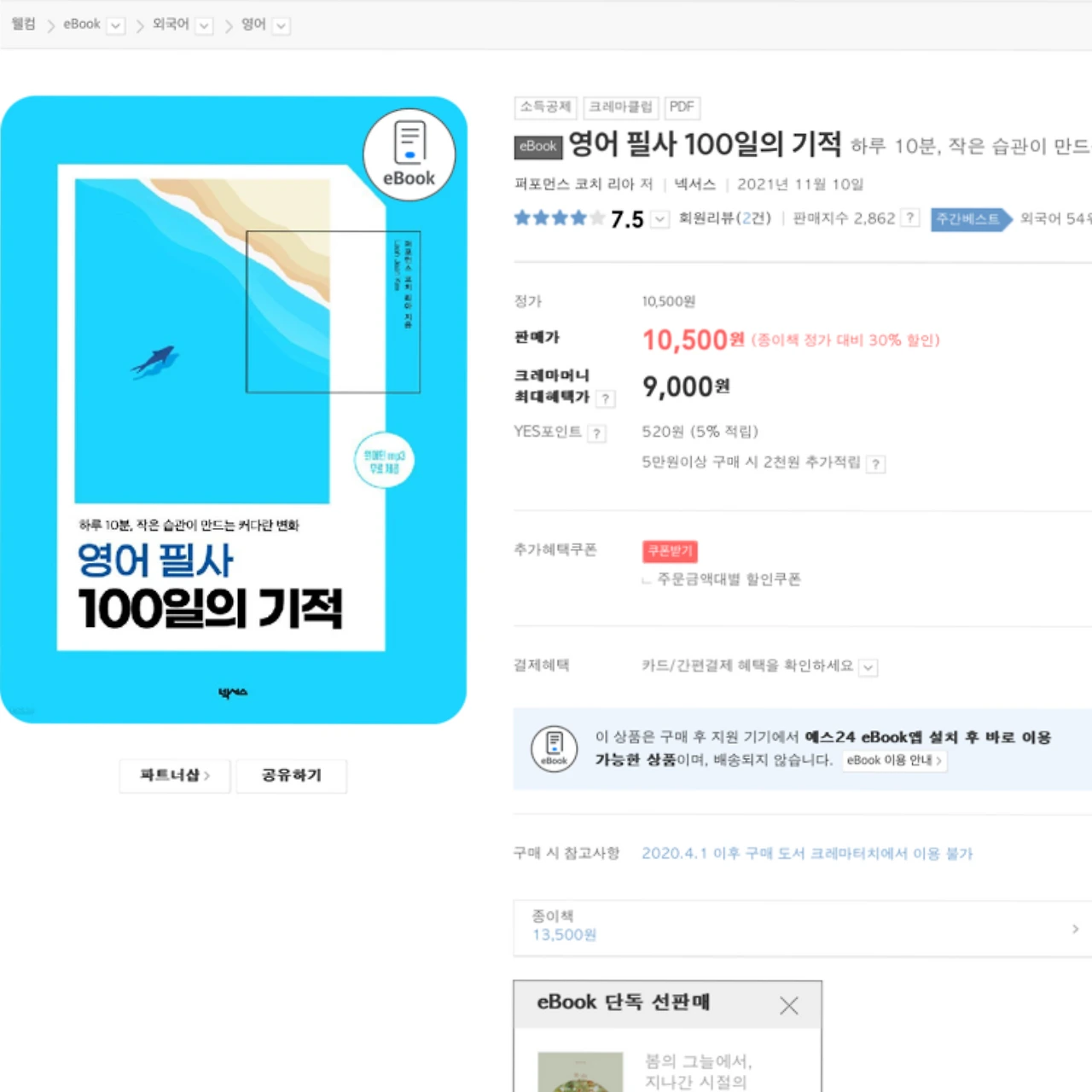 저는 Yes24의 크레마 클럽이라는 이북 서비스를 이용하고 있습니다. 그곳에서 ‘영어 필사 100일’로 검색했을 때 나오는 책 2권을 골랐어요. ‘하루 10분 영어 필사(위혜정, 더블:엔)‘와 ’영어 필사 100일의 기적(퍼포먼스 코치 리아, 넥서스)‘였습니다.