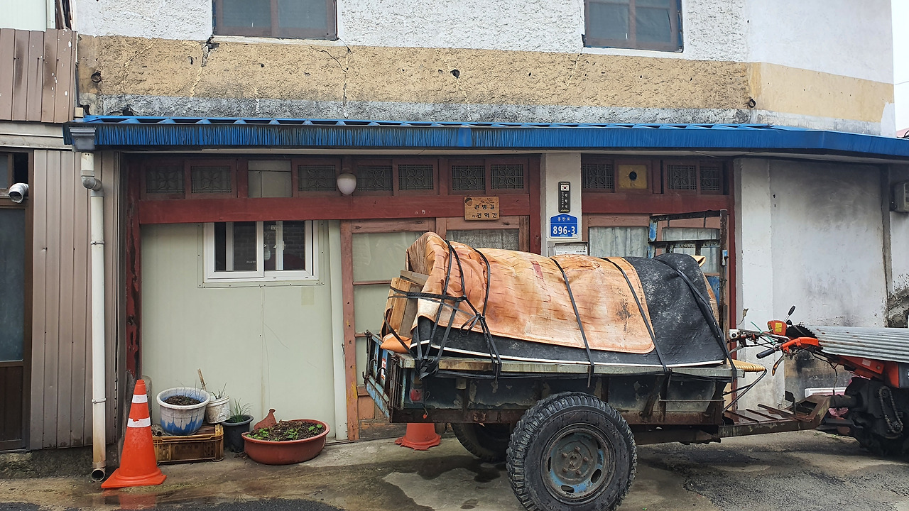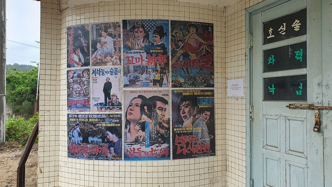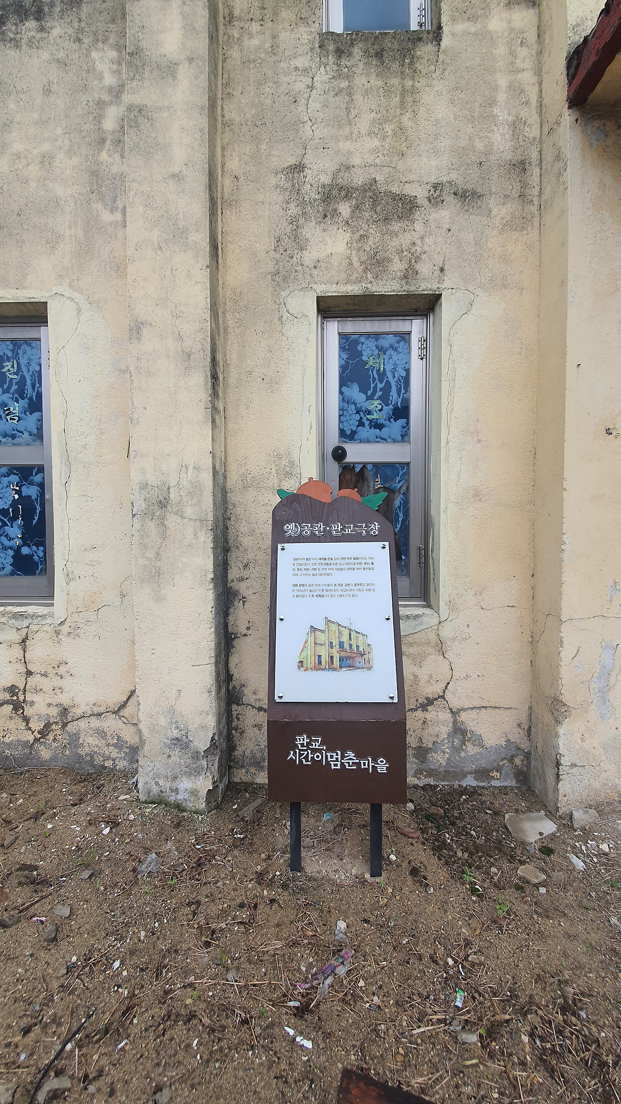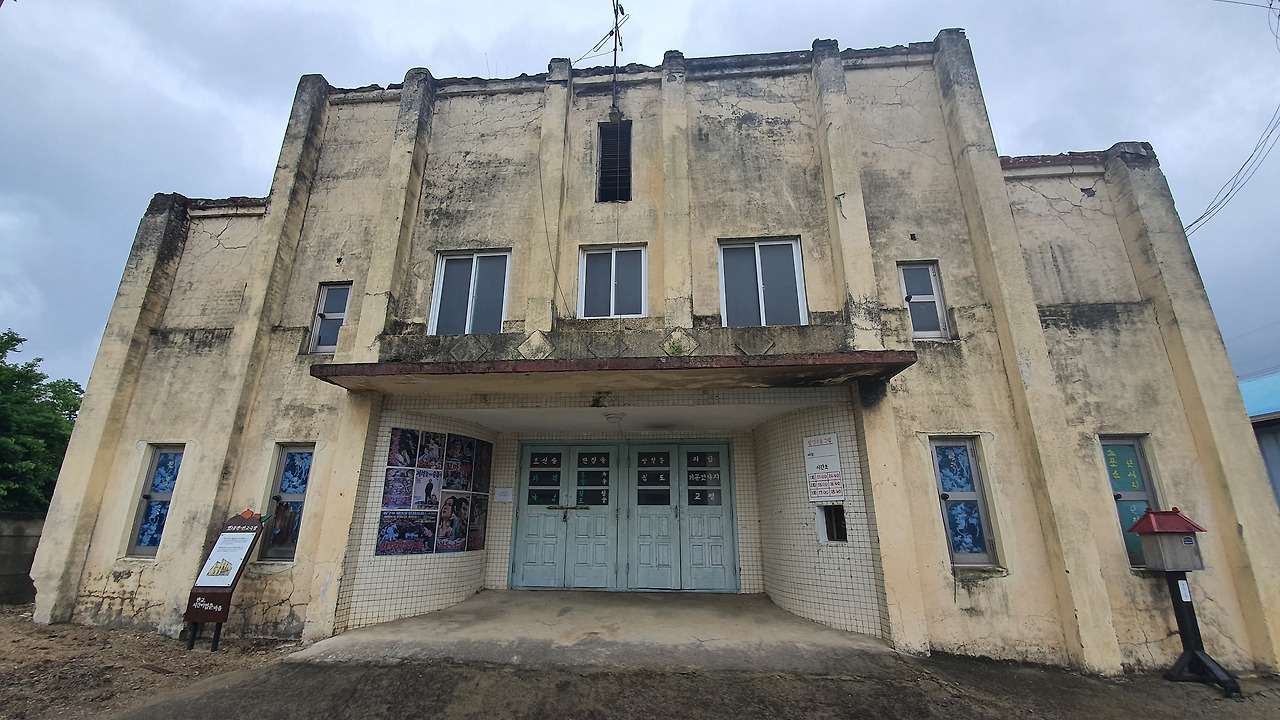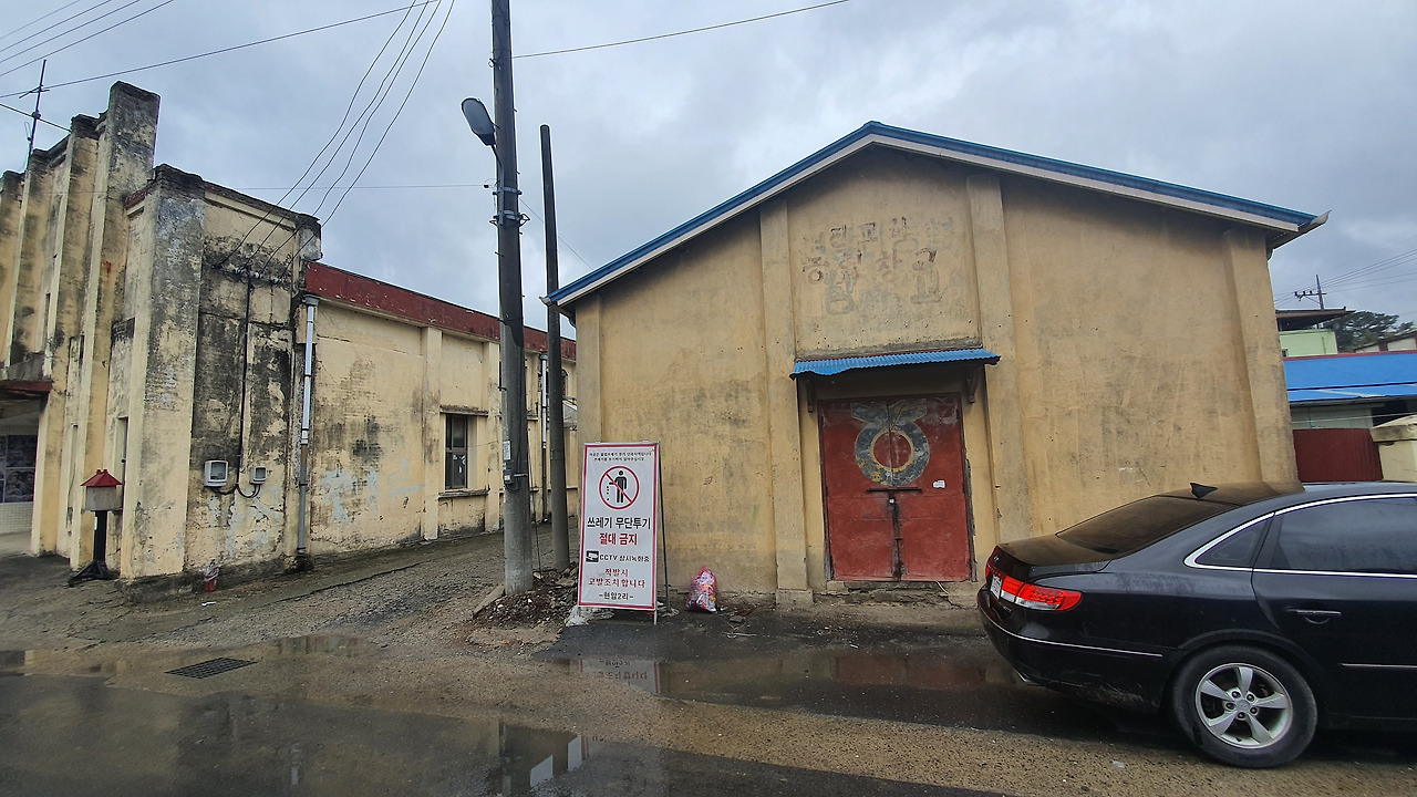 마을 입구에 있는 철공소의 전경을 찍으려고 골목으로 들어섰는데 거기 진짜 '물건'이 있습니다. 어릴 적 진주시 본성동에 있던 시공관을 떠올리게 하는 건물이었어요.