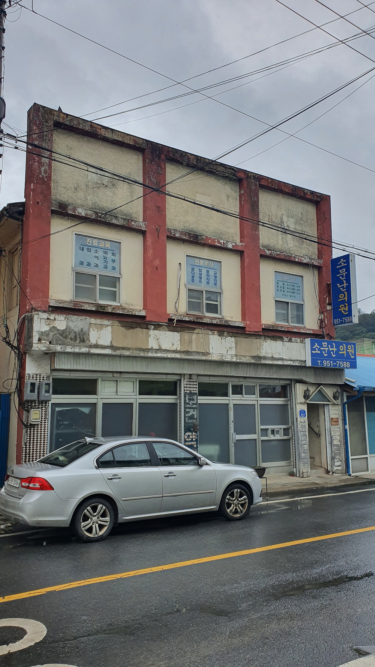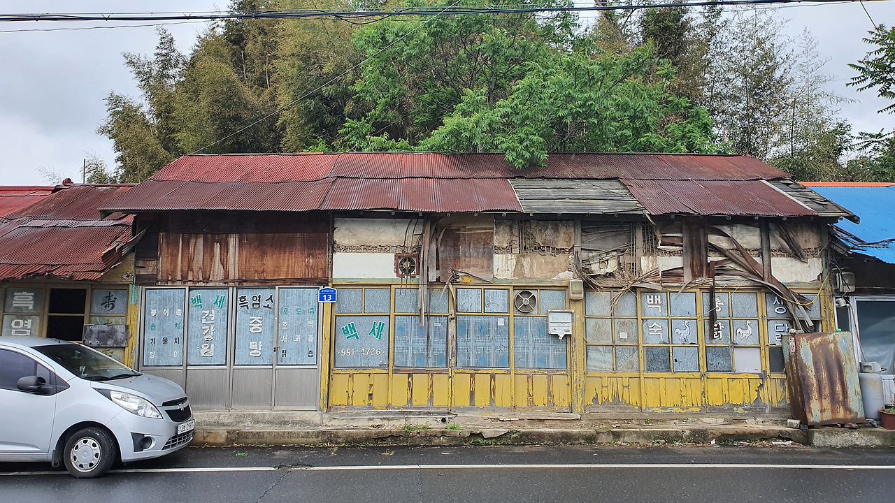 소문난의원은 있으나 (소문난)약국이 없군요. ^^ 의사가 직접 투약도 하는 분업예외지역이겠는데, 1층 입구에는 세로로 길게 박았던 <보건약국> 간판 글씨가 아직도 남아있습니다. 한달 월세는 얼마나 받으려나, 급수나 배수는 잘 될까, 오래된 한약방이 있으니 아무래도 텃세가 심하겠지 하는 쓸데없고도 행복한 상상을 해보았습니다. 비가 추적추적 내리는 날 시간이 멈춘 마을에 제격인 상상을요. 휴대폰 카메라로 건물 끝이 잘리지 않게 온전히 다 담으려 해도 더는 뒤로 물러날 공간이 없을 만큼 좁은 메인로드를 걸으면서, 행복하고도 쓸데없는 상상에 기분이 좋아졌습니다. 쓸데없음으로 남아있는것. 이런. 문학의 존재이유와 일치하는군요.