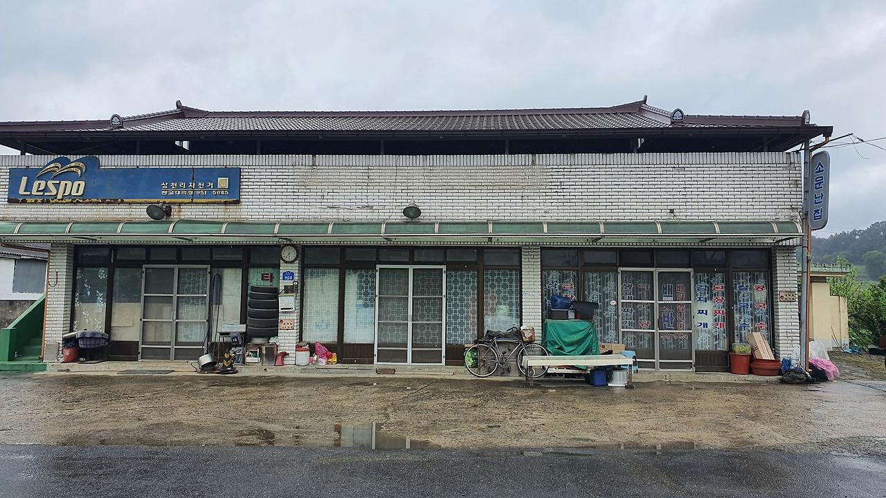 다리 위에 우선 차를 세웠습니다. 읍이 아닌데도 마을 규모가 제법 되는 것 같아요. 검은바위(현암)로 만든 현암2리 표지석을 두고 큰 다리가 놓였고, 삼천리자전거포와 한의원(다시 보니 한약방이네요)이 양쪽에 포진하고 있습니다. 한약방은 신축 건물이었으나 자전거포는 가로로 긴 단층 건물로 일제강점기를 배경으로 한 영화에서나 봄직한 집이랄까요. 한약방, 이용원, 시계점, 상회, 양품, 다방... 간판으로 훑어본 가게들이 대충 이랬습니다. 서서히 과거로 진입하는 느낌입니다.