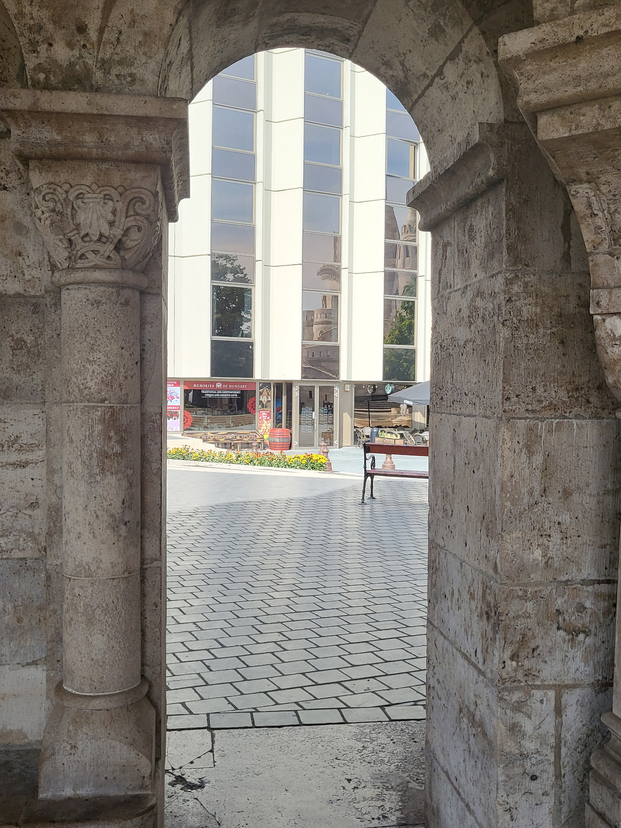 어부의 요새 기둥 사이로 1층이 스타벅스인 힐튼 호텔이 보인다.