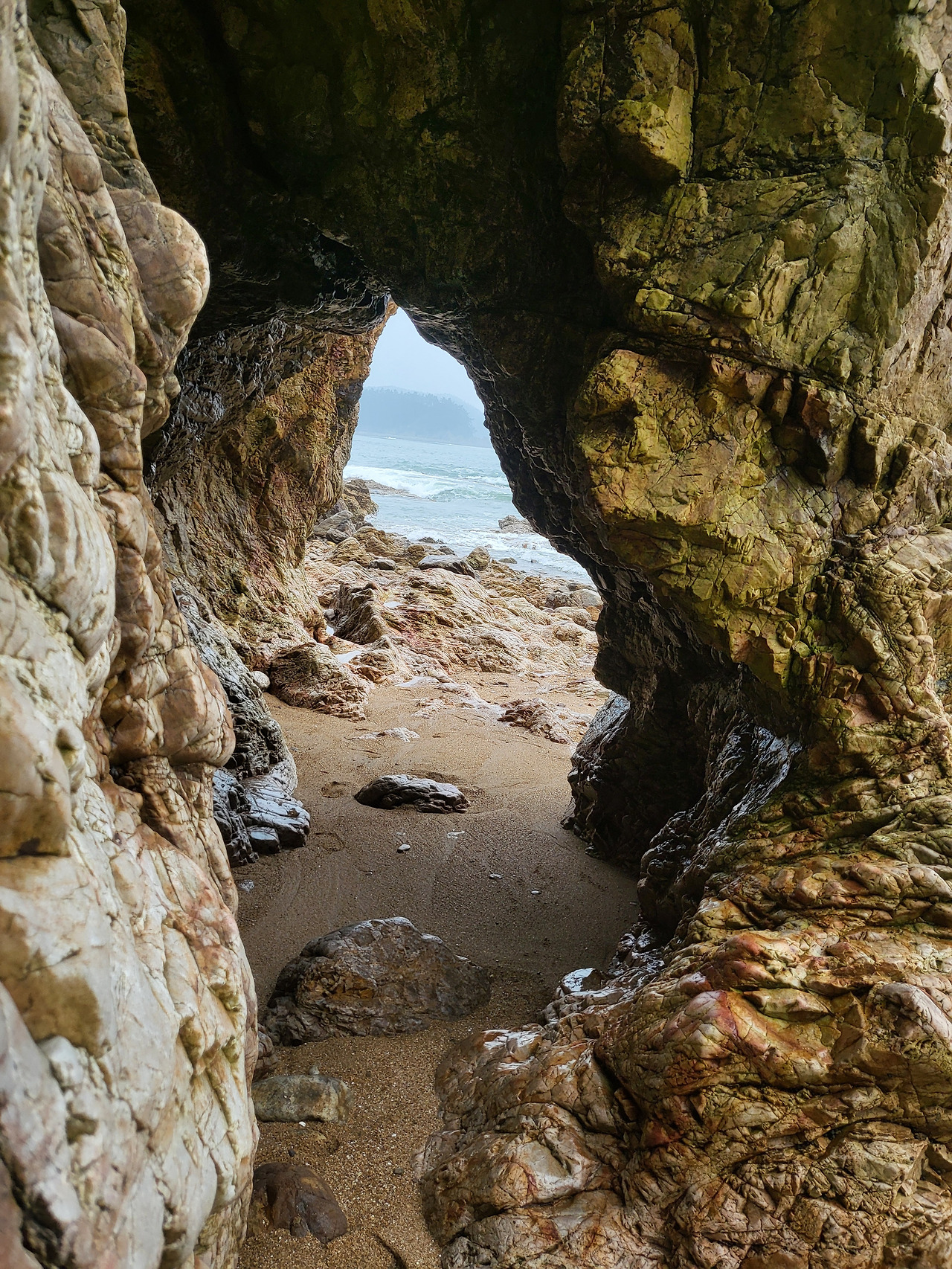 만조가 지나면서 물이 조금 빠졌지만 여전히 위험한 해변을 지나 마치 무인도에 표류한 사람처럼 허겁지겁 돌산을 넘고 또 넘어 해식동굴 앞에 섰다.