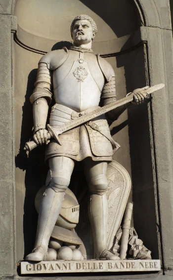 상인, 은행가로 시작해 피렌체의 실질적인 지배자가 되는 메디치 가문은 르네상스를 대표하는 문화, 예술의 후원자로 유명하다. (역사적 현실과는 별개로) 지성과 문치, 덕치의 이미지가 강해 무인과는 거리가 멀 것 같은 메디치 가문이지만, 이 집안 출신 중에도 크게 이름을 떨친 용병대장이 한 사람 있었다. 바로 조반니 델레 반데 네레 (Giovanni delle bande nere)라는 이름으로 더 잘 알려진 루도비코(혹은 로도비코) 데 메디치(Ludovico/Lodovico de' Medici, 1498-1526)다. '반데 네레'는 영어로 옮기면 'Black bands'가 되는데, 그가 이끌던 부대의 군기에 검은색 줄무늬가 들어 있었기 때문에 붙은 별명이라고 한다.