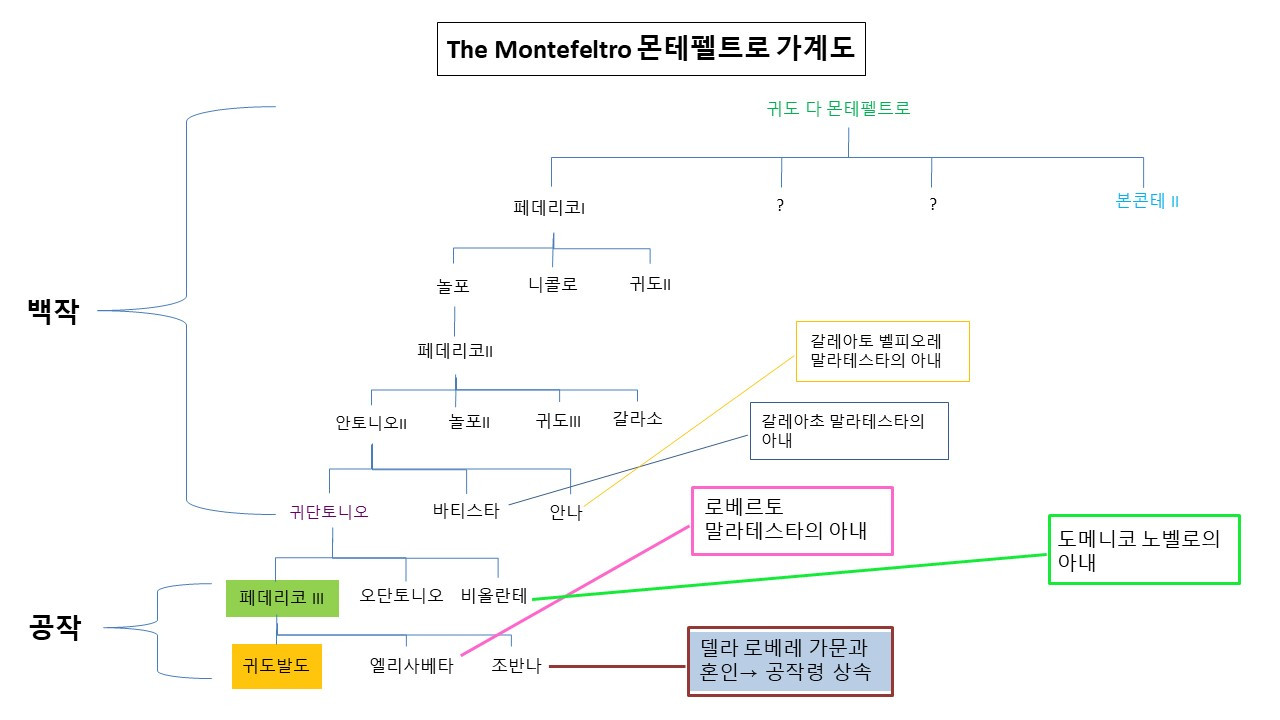 말라테스타만큼 많진 않지만 몬테펠트로 가문에도 극적인 인생을 산 이들이 있었다. 가장 유명한 것은 귀도 다 몬테펠트로의 큰아들 본콘테 Bonconte (또는 Buonconte) 2세다. 부친처럼 용병대장이었던 그는 아레초Arezzo의 황제당원들 편에 서서 교황당원들을 쫓아내고 이 도시의 군 사령관(Capitano del Popolo)이 됐다. 이후 시에나 군의 침입을 크게 무찔러 명성을 떨쳤으나 그 이듬해 아레초 군을 이끌고 캄팔디노 Campaldino전투에[14] 나섰다가 전사했다. 본콘테도 죽은 뒤 단테에 의해 불후의 명성을 얻었는데 지옥에서 고통받는 것으로 그려진 아버지 귀도와는 달리 신곡의 <연옥>편에 등장한다.[15]