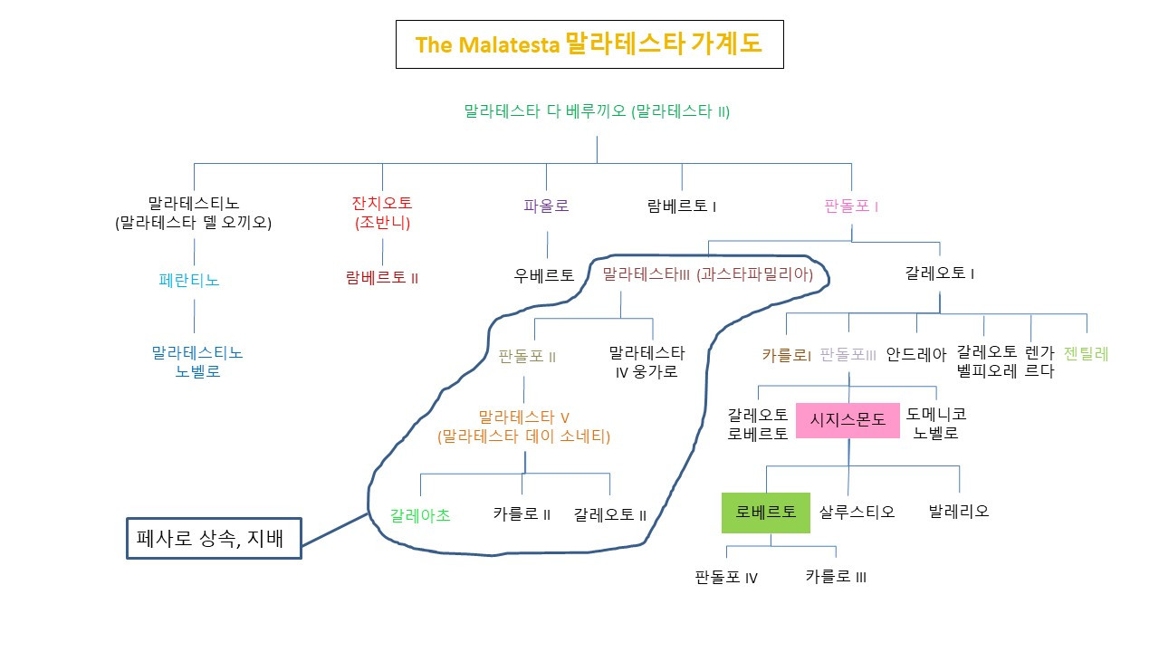 말라테스타와 몬테펠트로 두 집안은 시지스몬도와 페데리코가 태어나기 전에도 이미 여러 특출난 인물들을 배출했다. 사실 단테가 <신곡>에서 언급한 이 두 가문 출신의 인물은 말라테스타 다 베루끼오와 말라테스티노, 귀도 다 몬테펠트로만이 아니다. 당대 이탈리아 전역을 떠들썩하게 만들었던 치정사건의 주인공인 말라테스타 베루끼오의 다른 두 아들 잔치오토Gianciotto와 파올로Paolo도 <신곡>에 등장한다. 본명이 조반니Giovanni인 잔치오토는 선천적인 장애로 곱사등에 절름발이였지만 부친 못지 않게 유명한 콘도띠에로였으며 용맹하지만 잔인한 전사로 명성이 자자했다. 페사로의 포데스타podestà[4]였던 그는 라벤나를 지배하는 폴렌타 가문과 동맹을 맺고 이 집안의 딸 프란체스카Francesca da Polenta와 혼인하는데, <데카메론>의 저자 조반니 보카치오에 따르면 집안사람들에게 속은 프란체스카는 결혼 직전까지 잔치오토의 동생인 미남 파올로가 신랑인 것으로 알았다고 한다[5].