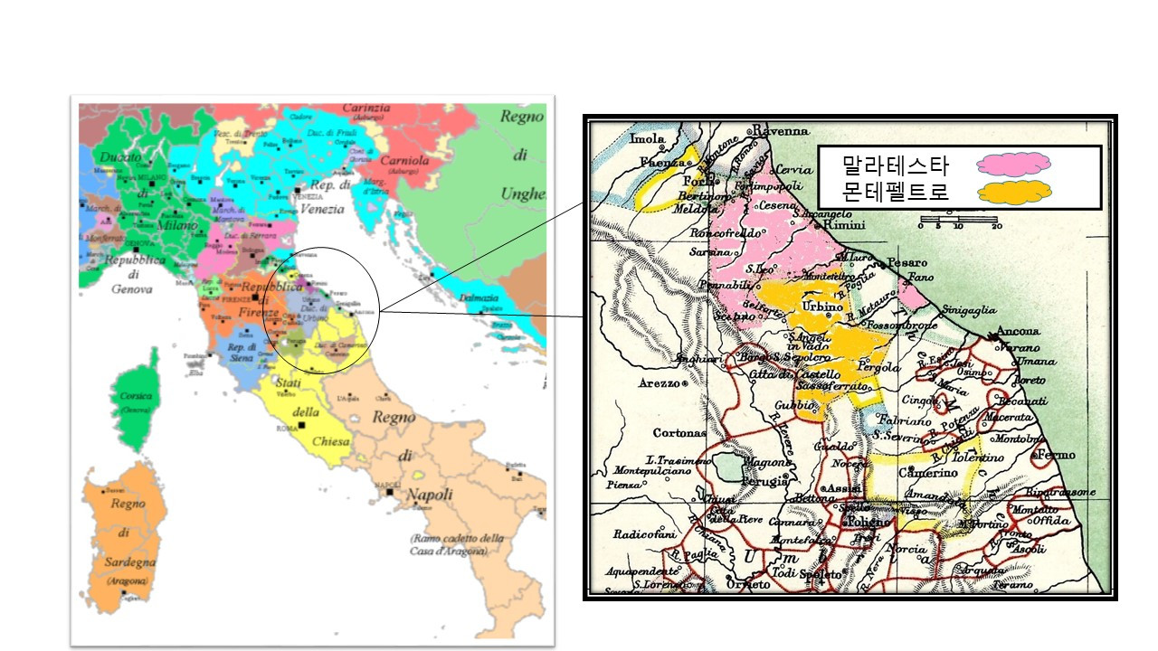 몬테펠트로(좌), 말라테스타(중) 가계도와 두 집안의 영토(우)