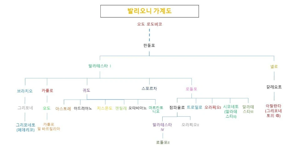 발리오니 가문 사람들: 왼쪽부터 잠파올로. 말라테스타 1세, 트로일로