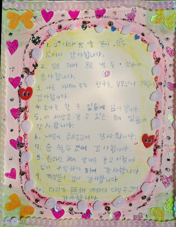 감사 일기를 쓸 때도 만다라 기법을 활용하면 좋다. 화면 중앙에 감사 일기를 쓰고, 그 둘레를 반복되는 색채와 문양으로 채우면 마치 마음에 울타리를 두른 것 처럼 보호 받는 느낌이 든다.