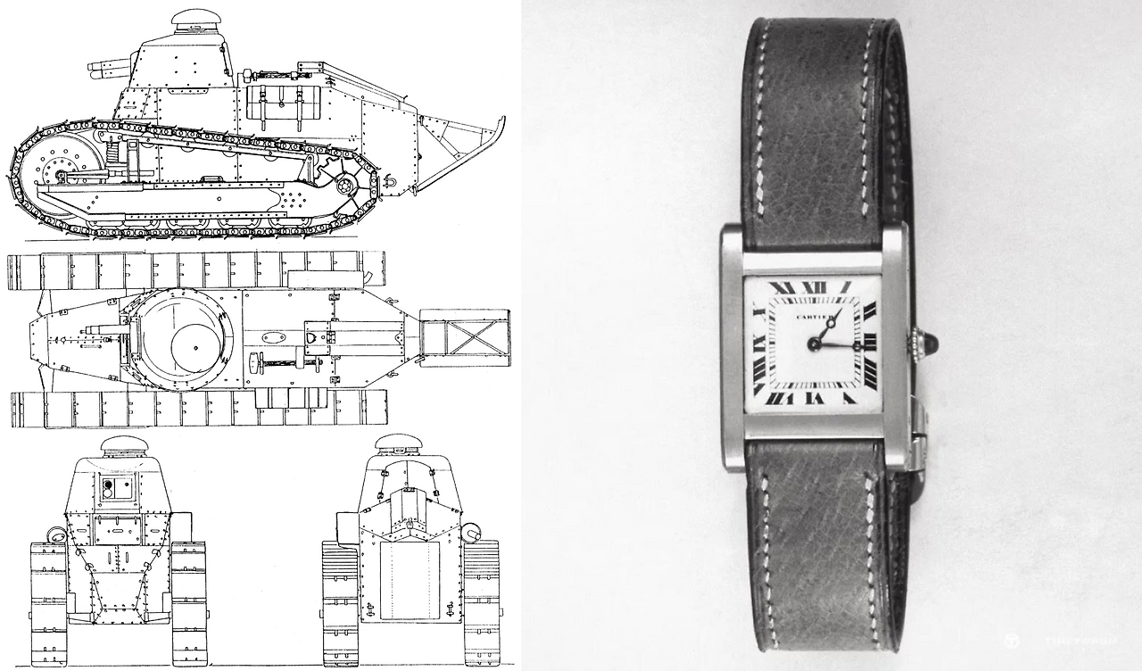 한편 브랜드 요소로 디자인을 가장 적극적으로 활용한 시계 중 하나는 까르띠에(Cartier)의 탱크이다. 탱크는 지난 100년이 넘는 세월 동안 그 형태적 원형을 유지하며 방대한 아카이브를 쌓고 수많은 이야깃거리를 생산했다. 아마 그 중심에는 탱크의 상징적인 형태가 한몫할 것이다. 흔히 탱크는 1차 대전 때 등장한 탱크인 르노 FT-17에서 형태적 모티프를 얻었다고 알려졌다. 직사각형 케이스의 로마자 숫자 인덱스가 가득 차 있는 다이얼의 고전적인 디자인을 가지고 있다. 100년이 넘는 세월 동안 유지되어 80대 할머니, 50대 어머니 20대 자녀도 멀리서도 쉽게 식별할 수 있는 형태적인 상징성이 있다. 하지만 이 직사각 시계라는 상징은 오롯이 조형적인 의미의 디자인에만 그 공로가 있을 것 같지 않다. 까르띠에의 탱크가 어떻게 지금의 탱크가 될 수 있었는지 명명백백히 알게 되는 날, 나는 브랜딩의 달인이 되어있지 않을까?