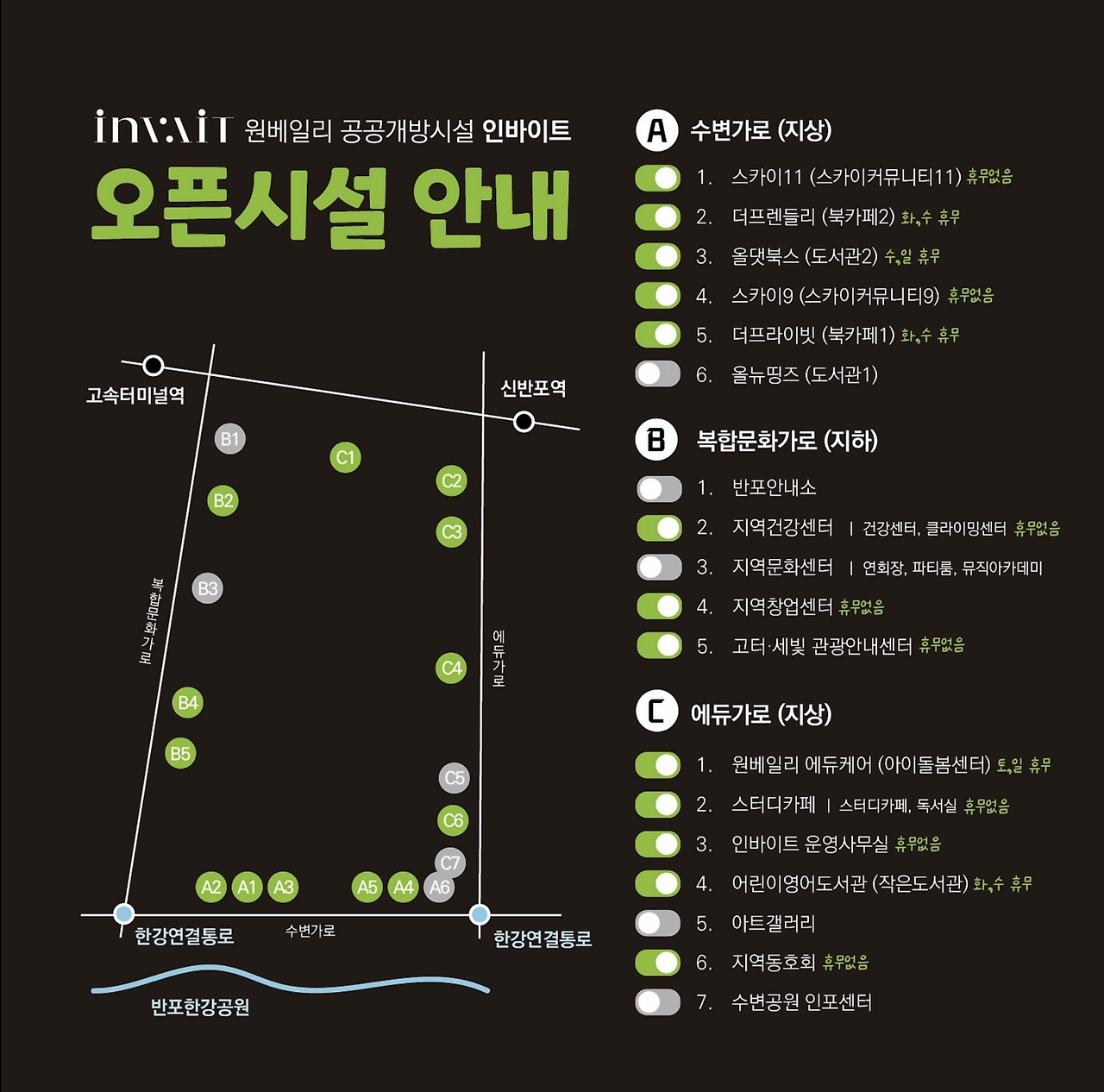반포 원베일리의 "인바이트"는 아파트 단지 내 주민공동이용시설을 시민에게 개방하는 새로운 시도를 보여주고 있습니다. 단지 내 스카이 카페, 클라이밍, 어린이 도서관, 싸이클링, 스터디카페 등 다양한 시설이 일반 시민들에게 개방되어 있으며, 이는 법적으로는 '주민공동이용시설'이지만 실질적으로는 '공공개방시설'로 기능하고 있습니다.
