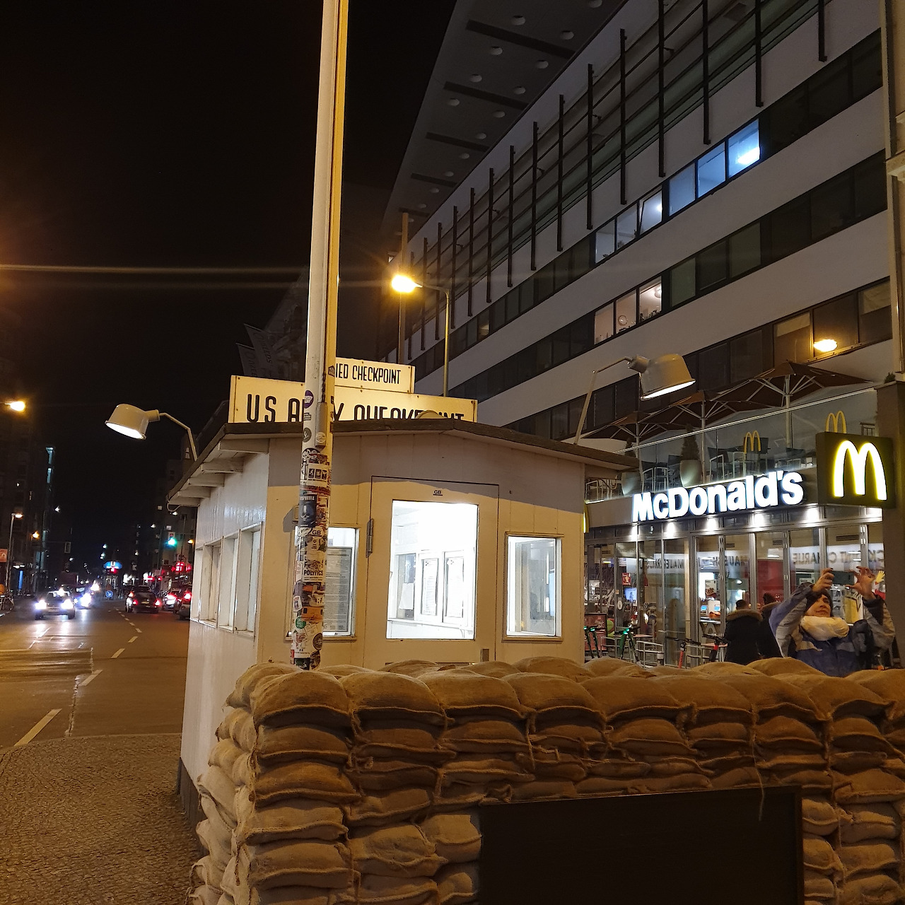 체크포인트 찰리는 연합국, 외국인, 외교관, 여행객 등이 동 베를린과 서 베를린으로 이동하기 위해 거치는 일종의 검문소였다. 우리나라로 따지면 판문점 정도? 1989년 베를린 장벽이 무너지고 난 뒤 1990년 폐쇄됐으며 현재는 작은 검문소 건물 하나만 중앙 도로에 덩그러니 남아있고 양옆으로 높은 빌딩들이 들어서 있다.