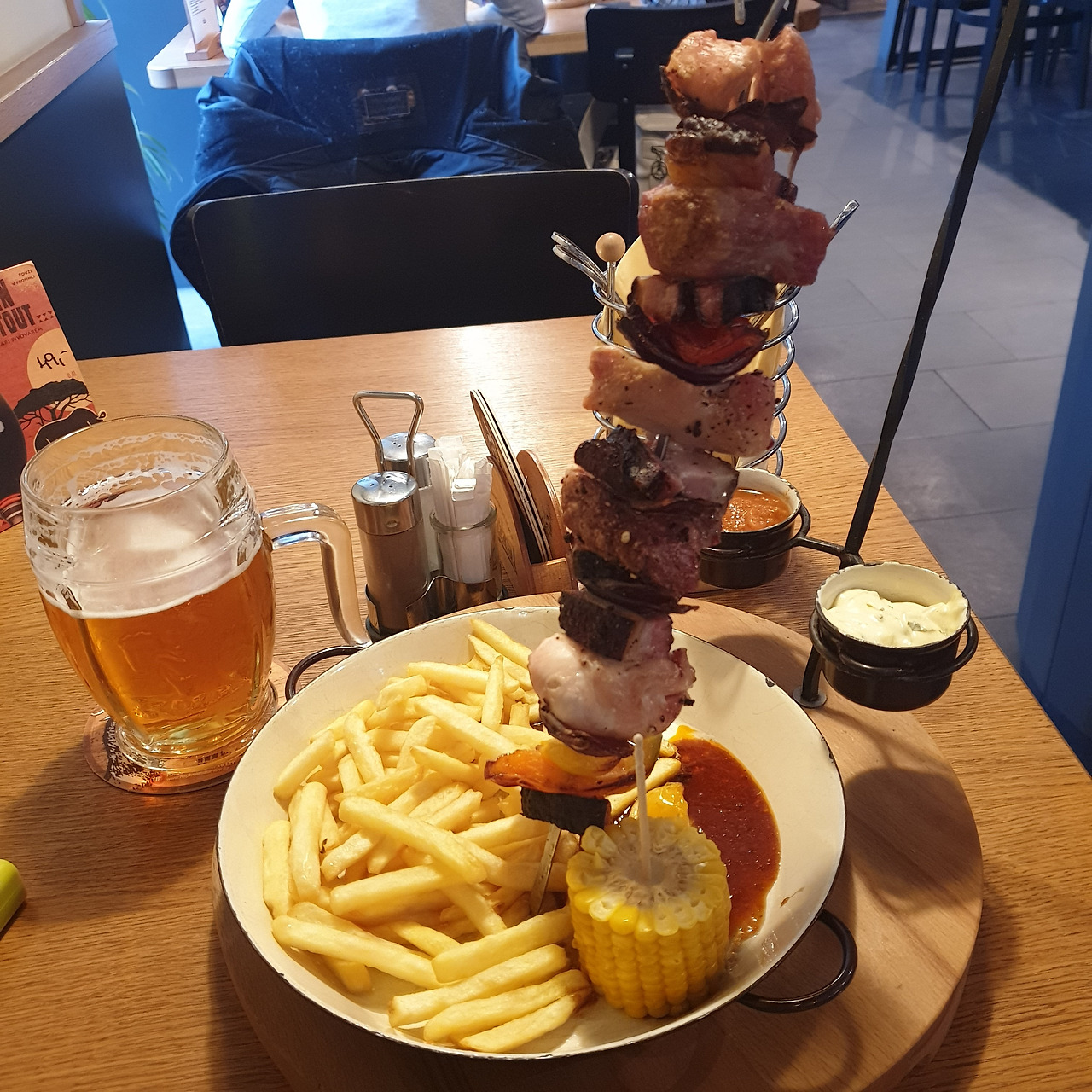호텔에서 빠져나와 본격 프라하 여행을 시작하기 전 우선 배부터 채우기로 했다. 호텔 데스크에 체코식 음식을 먹고 싶다고 했더니 바로 옆에 위치한 식당을 알려줬다. 들어가자마자 종업원에게 체코식 음식과 맥주 중 가장 잘 나가는 것을 추천해달라고 했더니 샤슬락과 식당 수제 맥주를 추천해줬다. 아 대낮부터 체코 맥주라니 벌써 두근두근 거린다. 가격은 둘이 합쳐서 한화로 약 8천 원 정도 나왔다. 일반 서유럽이었으면 2만 원 정도는 나왔을 텐데. 정말 물가가 싼 게 맞나 보다. 체코 정말 너무 마음에 든다. 맥주 맛을 표 헌 하자면 독일 맥주보다 좀 더 곡물 맛이 강했다. 시원한 탄산과 고소한 향, 정말 세상에서 완벽한 맥주다.