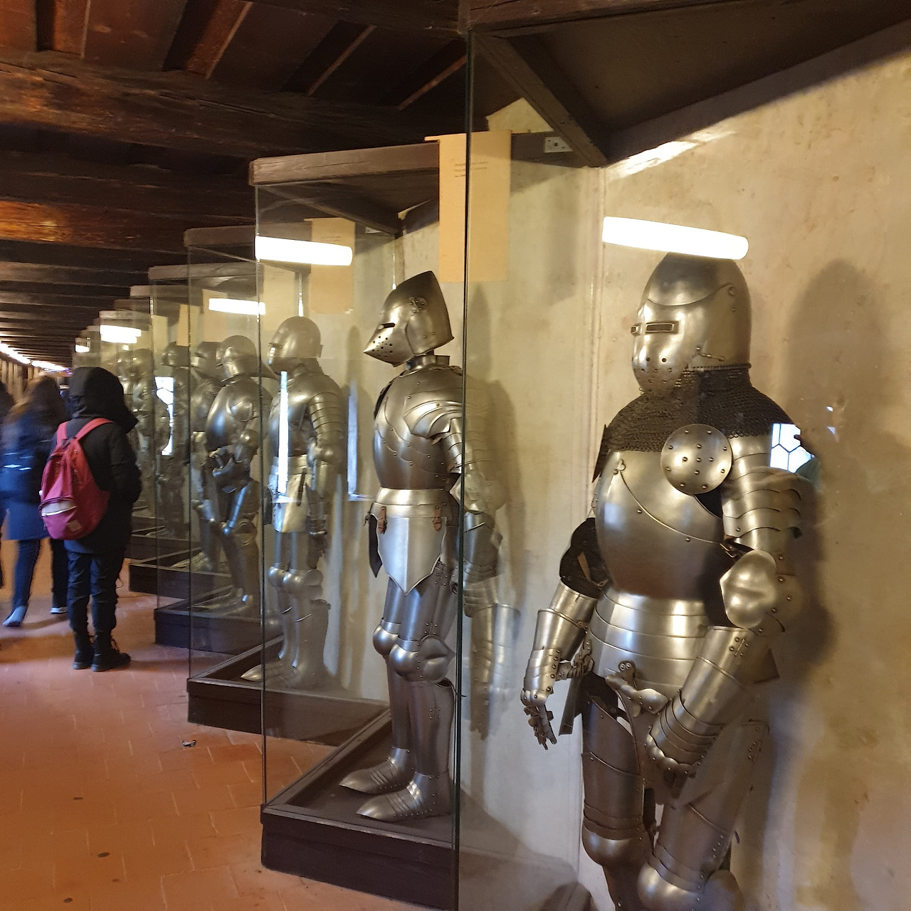 현재 마을은 박물관으로 사용되고 있다. 집들 내부로 들어갔더니 중세시대 기사들이 맞이하고 있다. 로보캅마냥 머리부터 발끝까지 철 갑옷으로 입혀져 있다. 안전하기야 하겠지만 이걸 입고 전장을 뛰어다녔다니 정말 힘들었을 거다. 심지어 말 한번 탈려하면 어땟을까. 제대로 다리 하나 올리는 것도 힘들어 보이는데... 저 복도 끝에는 중세시대 때 사용했던 석궁을 체험할 수 있다. 나도 1유로를 주고 체험을 해봤지만 과녁을 제대로 맞히는 게 쉽지 않다. 일단 석궁 자체가 너무 무겁고 장전하기가 매우 복잡하다. 화살을 쏘자 곧 퍽! 하고 둔탁한 소리와 함께 과녁이 찢어졌다. 사용하기엔 조금 복잡하지만 한번 쏘면 그 성능은 어마어마했을 거 같다.