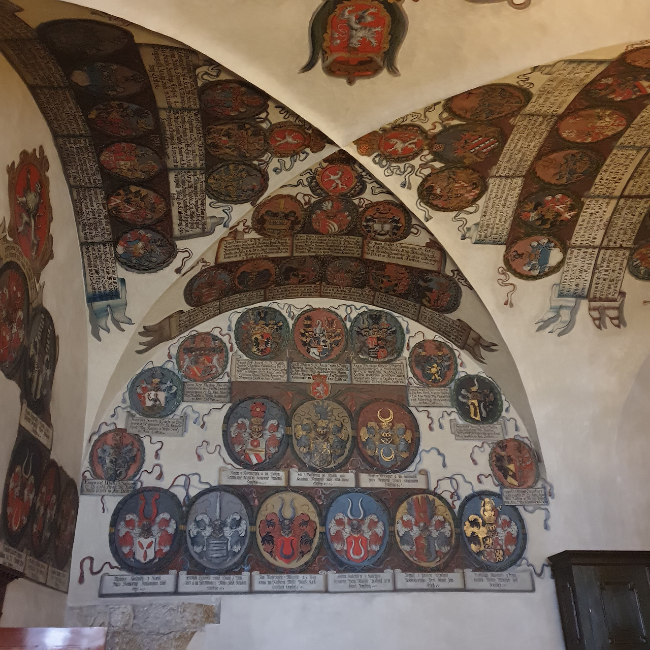 성안의 가구들 또한 옛날에 사용하던 그대로 보존되어있다. 아주 오래된 책장 속에 중세 언어로 적힌 책들이 빼곡히 쌓여있다. 천장 위쪽을 보니 이상한 앰블램들이 줄지어 그려져 있다. 그림 상태로 보면 아마 이것도 못해도 500년은 넘어 보인다. 내 예상엔 프라하 성주의 가계도와 휘장에 대해 적혀있는 거 같다.