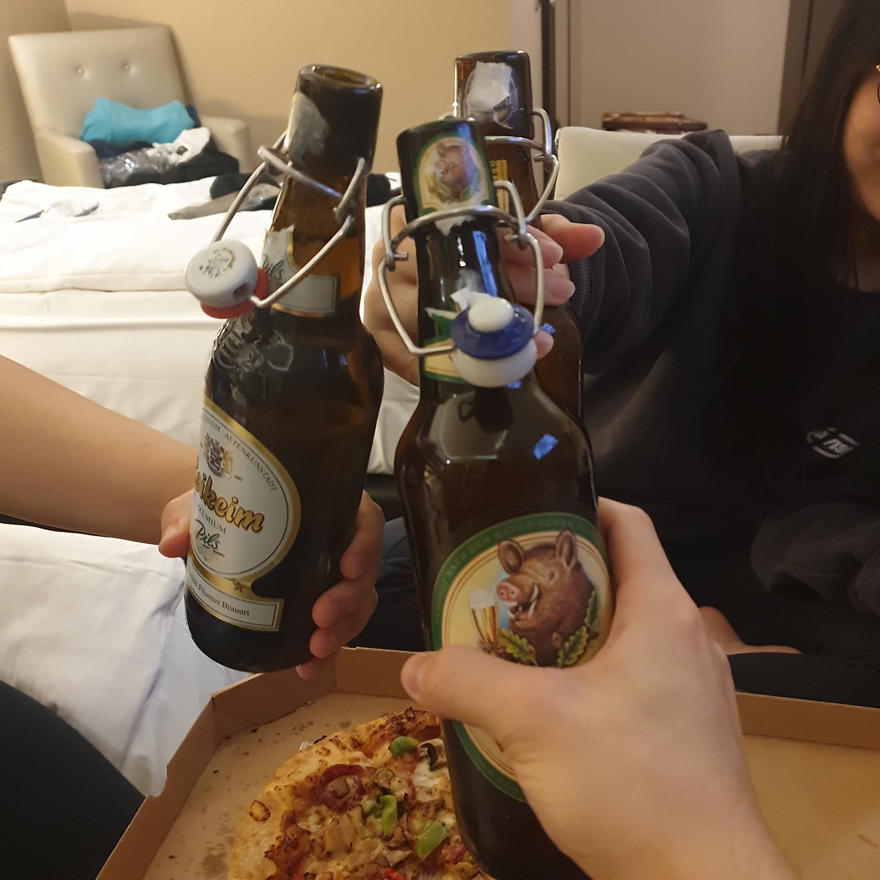 중앙역에서 누나와 사촌동생을 기다리며 커리 부어스트(Curry Wurst)를 먹었다. 역시 독일의 소울 푸드! 이건 어느 때나 먹어도 맛있다. 파는 곳마다 커리맛이 다르기 때문에 질리지 않고 매일매일 먹을 수 있다. 중앙역 한가운데서 커리 부어스트를 먹다 보니 누가 내 어깨를 툭툭 쳤다. 돌아보니 누나랑 사촌동생이었다. 지하철역에서부터 올라오면서 외쳤다고 하는데 내가 커리부어스트 맛에 빠져있느라 못 들었었다. 뭐 어쨌든 만났으니 됐지. 어서 호텔로 돌아가 독일 초보자인 누나한테 맥주나 소개하기로 한다. 역시 맥주는 독일이지!