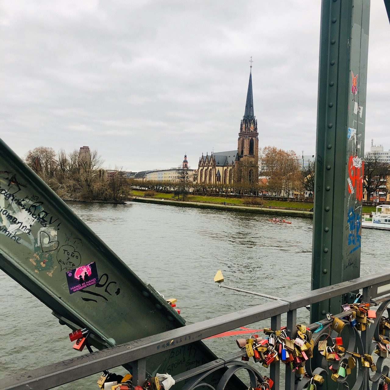 광장 밑에는 마인강을 잇는 아이젤너 다리가 있는데 이것도 프랑크푸르트에서 꽤나 유명하다고 하다. 강 사이에 다리 하나 덜렁 있을 뿐인데... 다리가 예뻐서인가, 아님 다리 너머로 보이는 풍경이 예뻐서인가. 잘 모르겠지만 다리 난간엔 사랑의 자물쇠마냥 자물쇠들이 빼곡히 잠겨져있는 걸 보니 유명한 곳은 맞나 보다. 하지만 프랑크푸르트에는 이 다리보다 더 유명한 게 있지. 그게 뭐냐면 바로 괴테(Goethe)다
