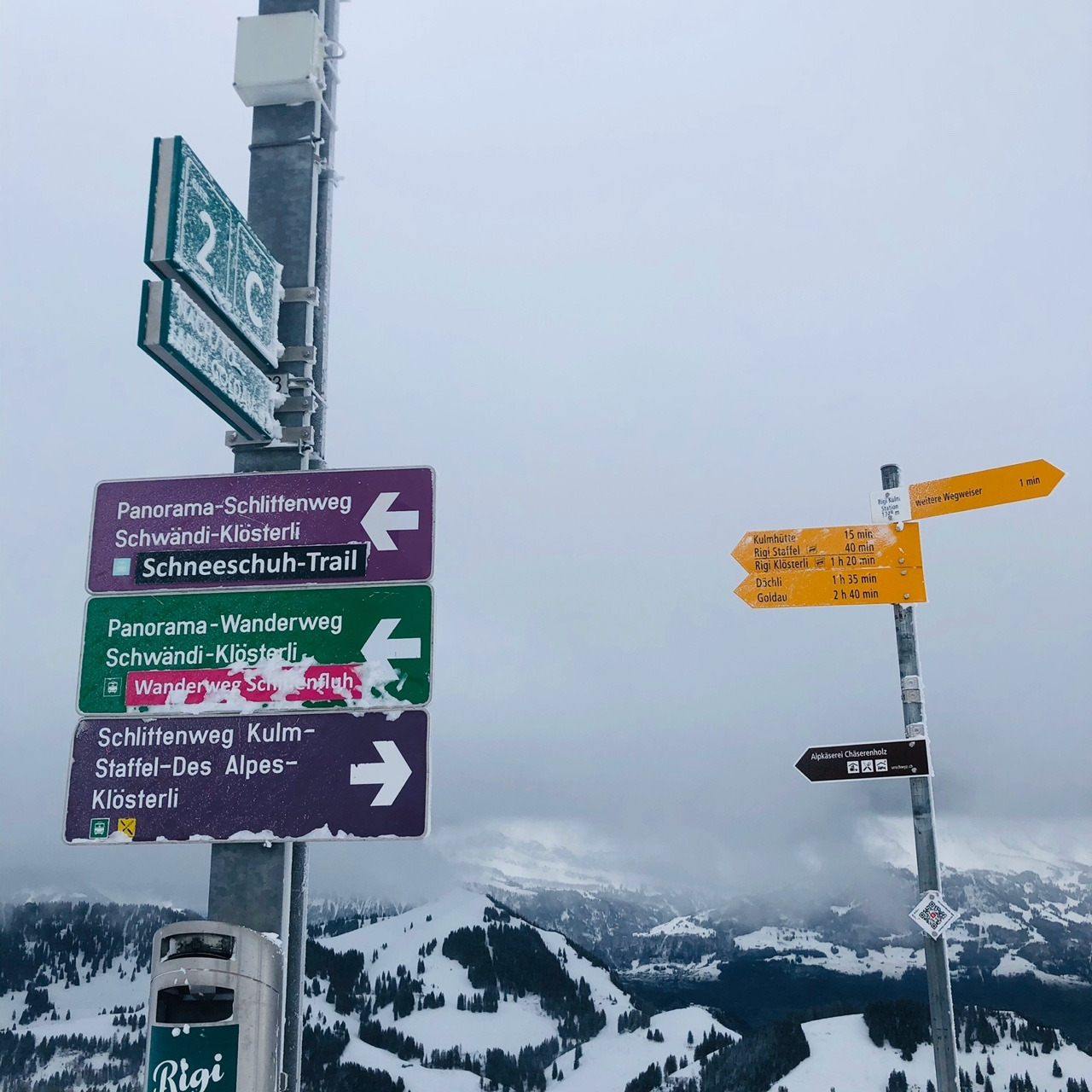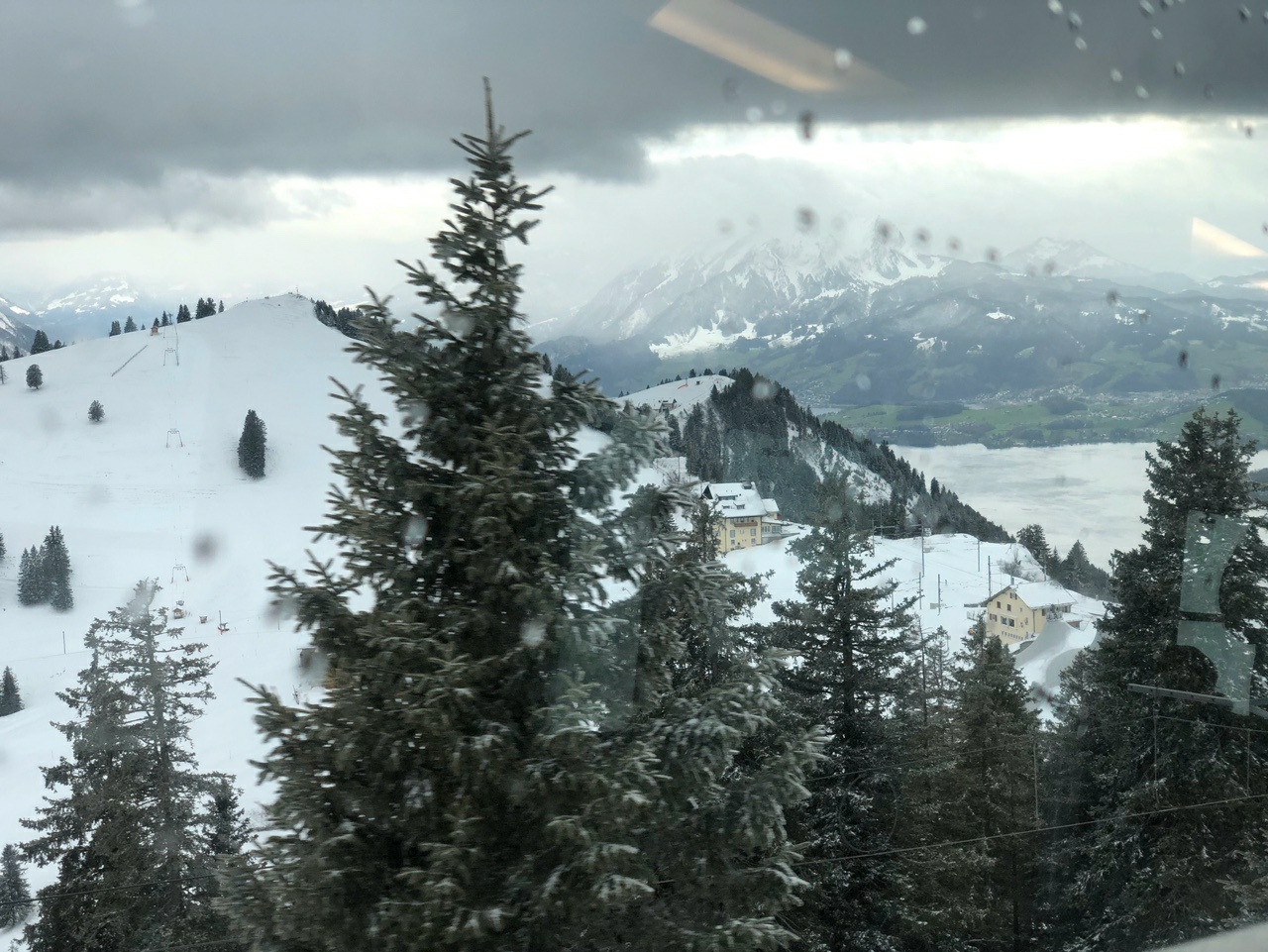 올라갈수록 바뀌는 고도와 함께 날씨도 맑음에서 비, 그리고 눈으로 급격하게 바뀐다. 비츠나우에서 리기산 정상까지는 40분 정도 걸린다. 중간중간 스키장을 경유하며 아주 천천히 올라가는데 이것 또한 밖의 풍경을 구경하느라 40분이 언제 지나갔는지도 모른 체 올라간다.