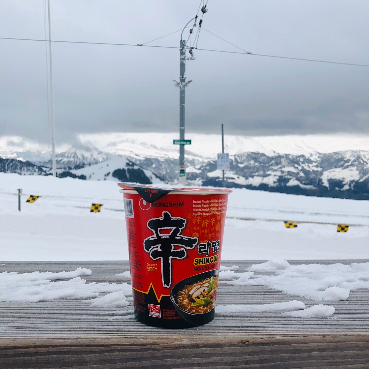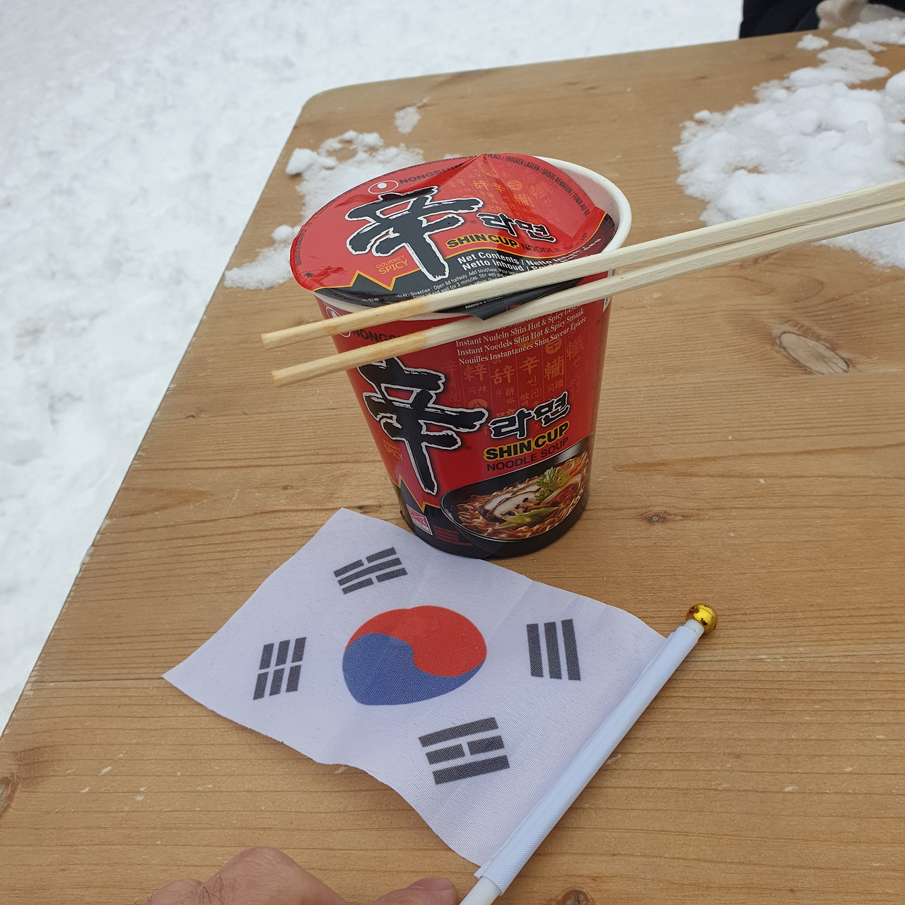 산에 오면 뭘 해야 한다? 바로 라면과 태극기 들고 사진 찍기! 외국에 있는 산이라도 예외는 없다. 독일에서부터 가져온 신라면에 휴게소에서 제공하는 뜨거운 물을 붓고 태극기를 꺼내 들어 휴게소 밖 벤치로 나섰다. 이 맵고 따뜻한 라면과 함께라면 어떤 추위도 두렵지 않다. 저 얼어 죽을 날씨에 야외에서 라면을 먹는 사람은 아마 우리밖에 없었을 거다.