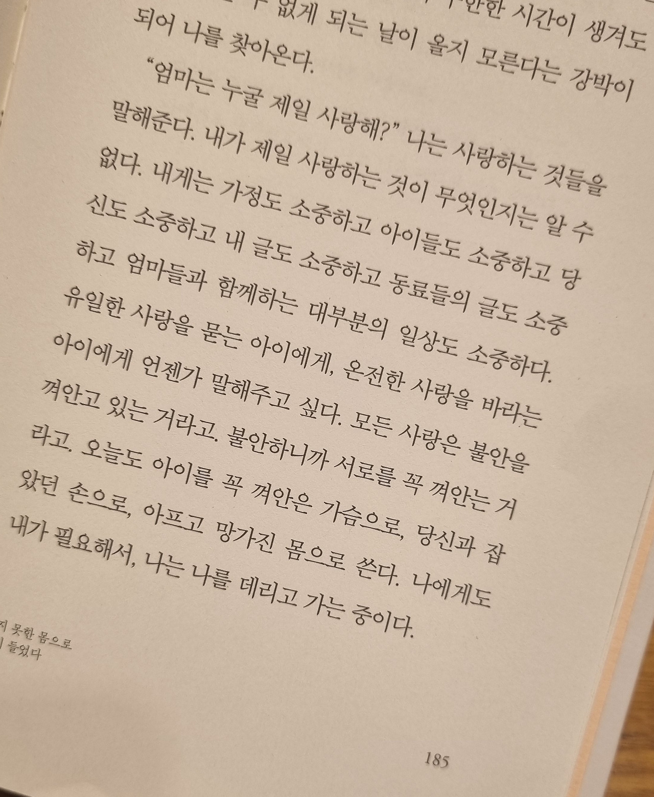 <쓰지 못한 몸으로 잠이 들었다>는 작가이자 엄마인 6명의 여성들이 육아와 가정, 일의 모순 속에서 살아남았고 또 그러려고 노력하는 글 모음이다. 저자가 여럿이라, 한참 유아기 육아의 소용돌이 한가운데에 있는 작가, 중고등 어느 정도 키워놓고 보니 한숨 돌린 듯 싶지만 여전히 불안한 작가, 그때도 좌절이었고 지금도 좌절이라 외치는 작가 등, 저마다 구구절절하다. 작가들의 사연이다 보니, 단어 하나하나가 문장 구절구절마다 팍팍 내꽂힌다. 절망과 실망, 무기력과 우울함을 이렇게 우아하게 묘사할 수도 있구나 싶었다.