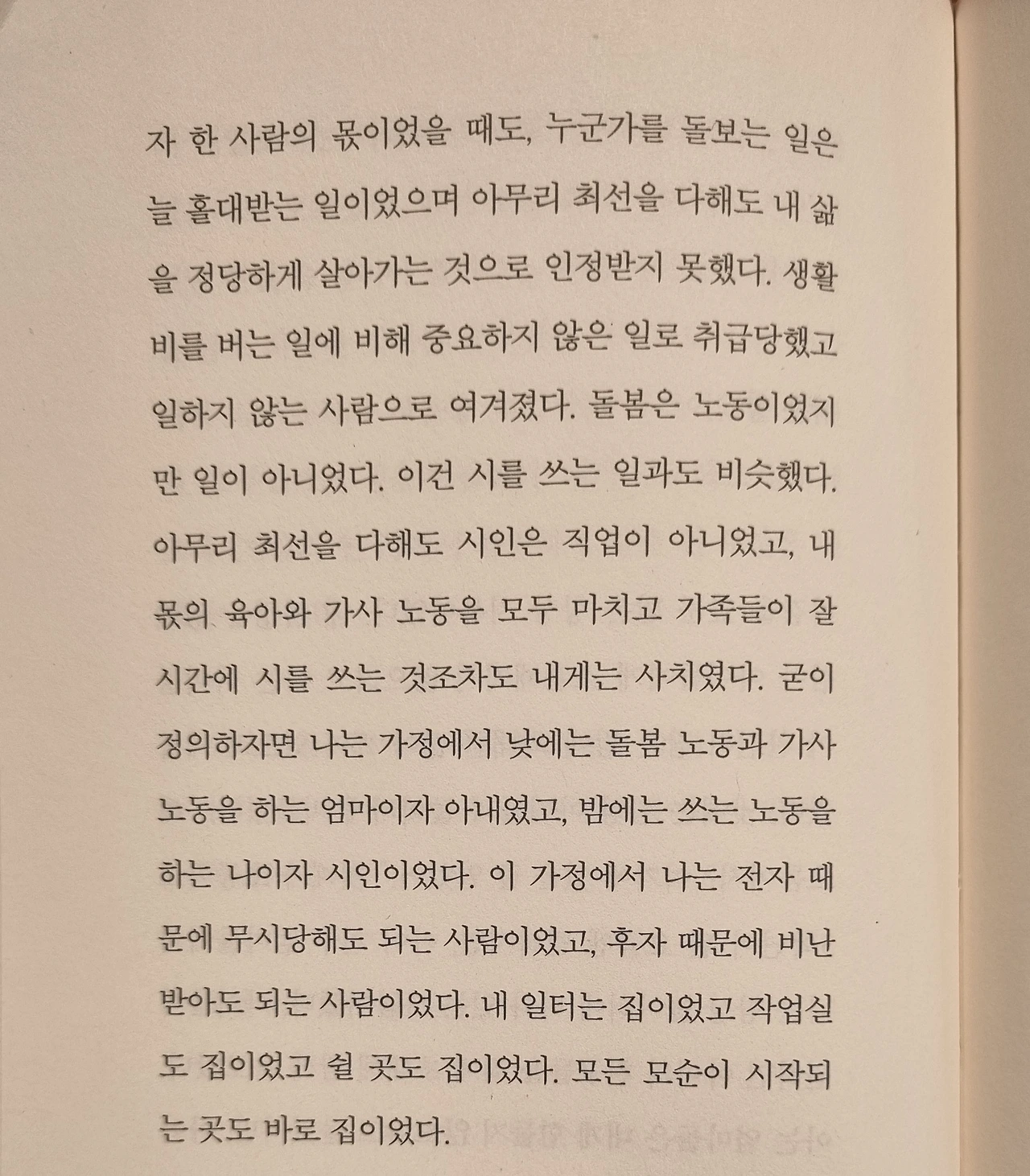 "돌봄은 노동이었지만 일이 아니었다. 이건 시를 쓰는 일과도 비슷했다. 아무리 최선을 다해도 시인은 직업이 아니었고, 내 몫의 육아와 가사 노동을 모두 마치고 가족들이 잘 시간에 시를 쓰는 것조차도 내게는 사치였다. 굳이 정의하자면 나는 가정에서 낮에는 돌봄 노동과 가사노동을 하는 엄마이자 아내였고, 밤에는 쓰는 노동을 하는 나이자 시인이었다. 이 가정에서 나는 전자 때문에 무시당해도 되는 사람이었고, 후자 때문에 비난 받아도 되는 사람이었다. 내 일터는 집이었고 작업실도 집이었고 쉴 곳도 집이었다. 모든 모순이 시작되는 곳도 바로 집이었다."(조혜은, p.164)