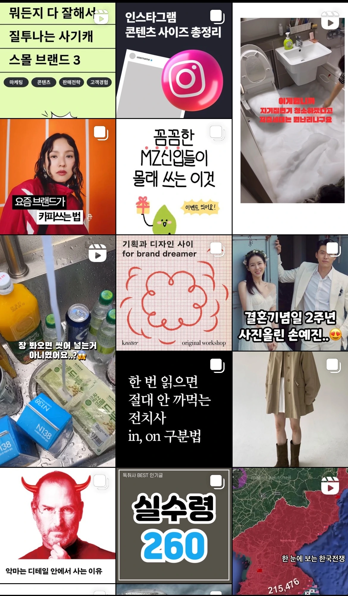 위 이미지는 4월 1일 기준으로 캡처해 본 인스타 탐색 탭입니다. 총 13개 중 4개가 릴스 게시글을 보여주고 있으며, 심지어 피드 게시글임에도 동영상으로 이루어진 콘텐츠도 있습니다. 현재 카드뉴스만큼 숏폼 영상 콘텐츠가 큰 인기를 끌고 있다는 점을 알 수 있습니다. 또한, 피드 게시글에도 음악도 추가할 수 있어 사람들의 이탈을 막는 하나의 요소가 될 수 있겠다는 점도 알 수 있죠.