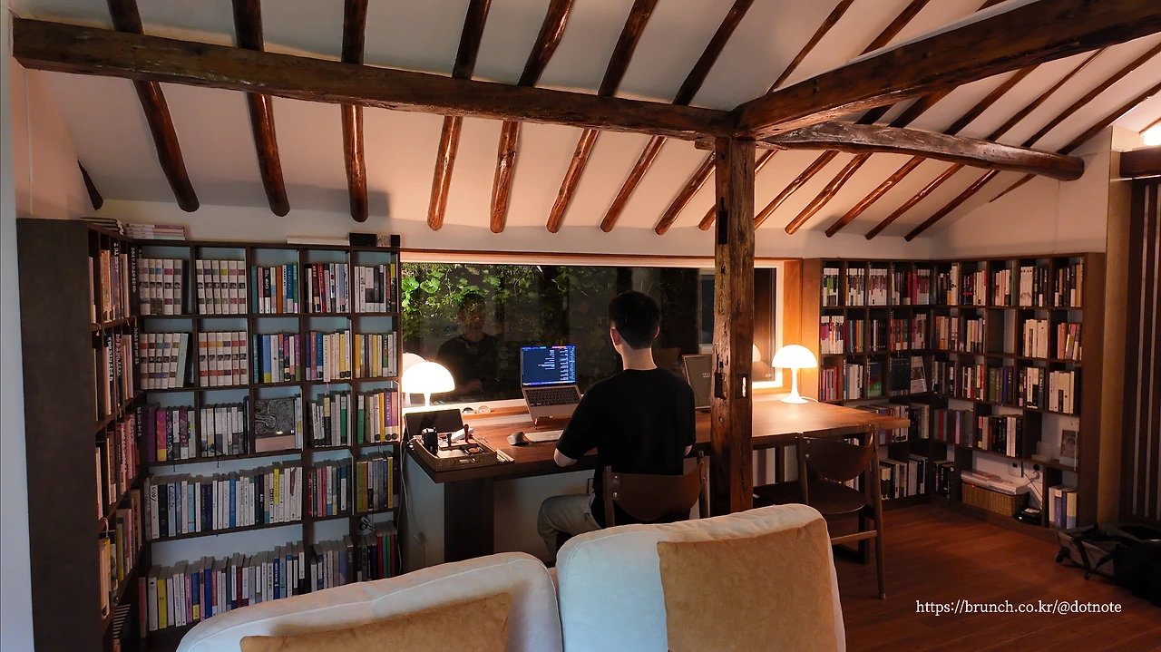 긴 원목 책상, 빽빽한 책장, 손글씨로 남겨진 방명록.