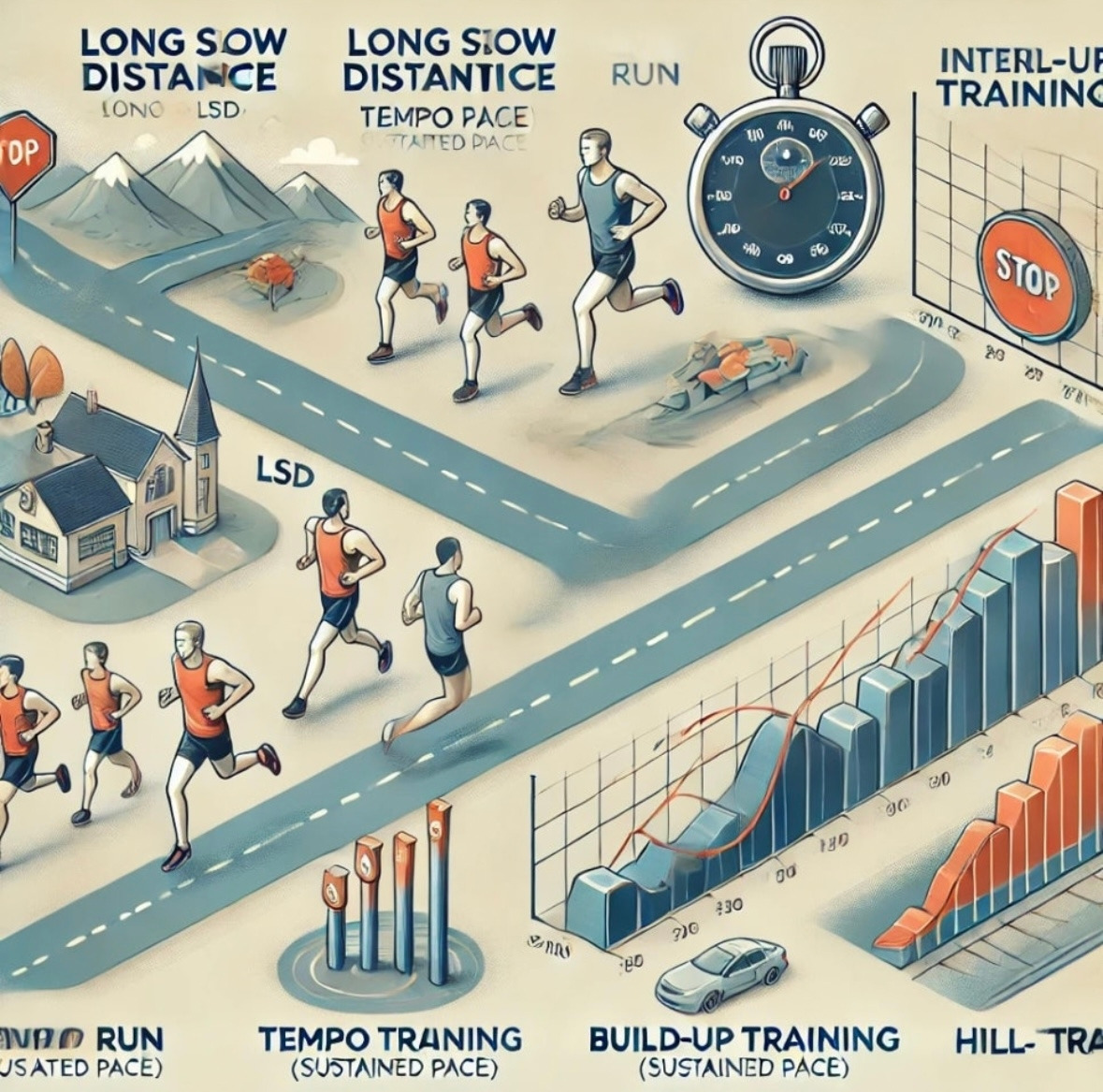 시간주, 거리주, 지속주, 빌드업, 인터벌, 업힐, 파틀렉, TT, LSD 등 많기도 많다.