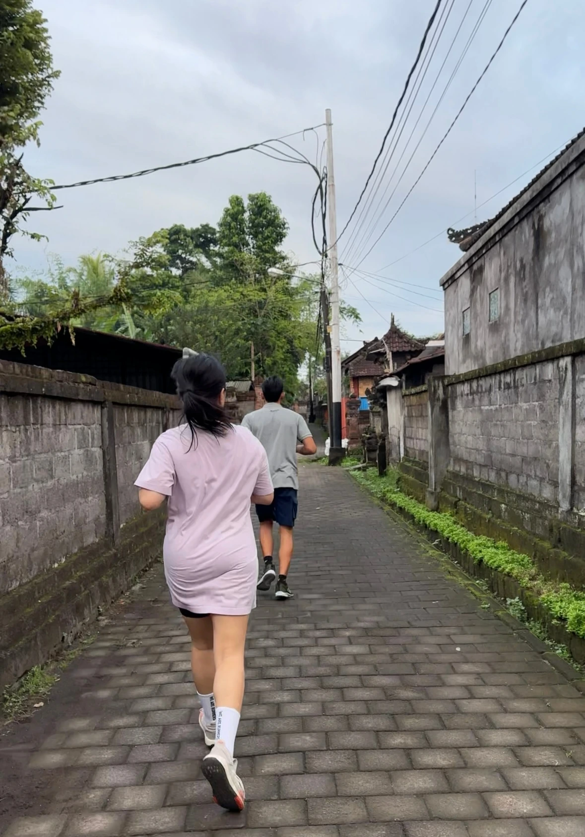 그야말로 발리 스러운 배경을 정신없이 눈에 담고 있는 그때쯤 가운데서 뛰던 아내가 뒤돌아 나를 힐끗 쳐다보며 조금 거칠어진 호흡과 발갛게 달아오른 얼굴로 무언의 신호를 보내기 시작했고 결국 잠시 후 조금 힘들다며 나와 포지션 변경을 요청했다. 인솔자에게 페이스를 조금 늦추자고 말을 할까 하다가 그는 조깅이 시작되고 5분여 정도 후 주택가에 접어들고서부터 한 번도 뒤돌아보지 않고 자신만의 레이스를 즐기고 있는 것 같았고, 평소 승부욕이 강한 그녀(특히 나에 대한 승부욕이 강한 편)가 괜찮다며 뒤에서 천천히 따라오겠다고 말했기에 내가 인솔자와의 거리를 약간 두고 달리는 정도로 약간만 페이스를 조절하여 달리기를 이어갔다.