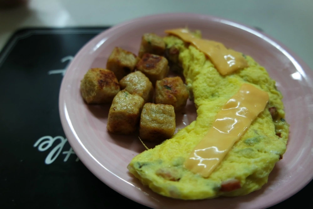 양파와 햄을 또닥또닥 썰고 나서 안이 촉촉한 계란 오믈렛을 만들어 냈고, 먹어본 닭가슴살 중 최고 맛있는 것 같은 큐브형 닭가슴살을 팬에 볶아서 접시에 담아줬다.