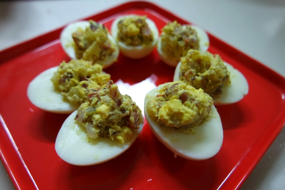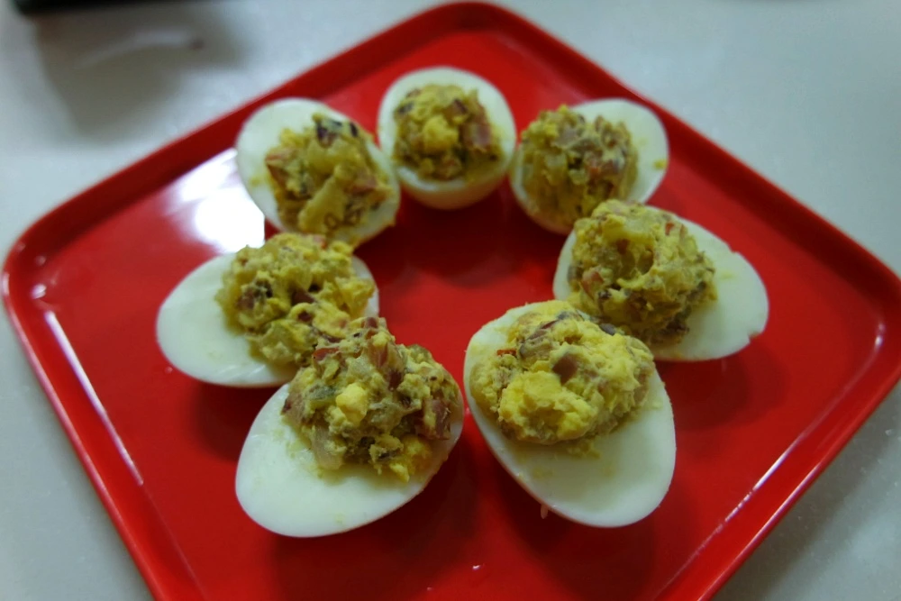 삶은 계란을 반으로 갈라 노른자를 파내고 그 노른자와 다진 양파, 햄 마요네즈 쪼금(다이어트 중이니까요)에 씹는 맛과 상큼함을 살려줄 피클을 넣고 그 크고 통통한 손으로 요 작은 흰자 안에 소복이 담아간다.