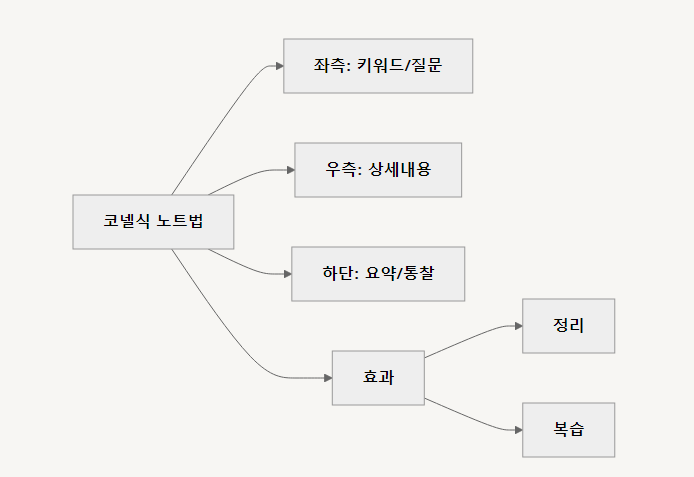 코넬식 노트법은 지식을 체계적으로 정리하는 데 매우 효과적인 방법입니다. 이 방법은 페이지를 세 영역으로 나누어 활용합니다.