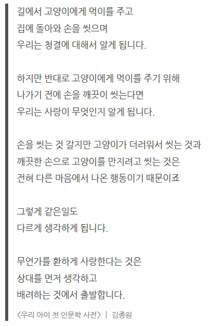 아이가 물었다. "아빠, 사랑이 뭐야?" 순간 김종원 작가님의 말씀이 떠올랐다. 나는 아이에게 이렇게 말했다. "아까 우리 공원에서 고양이 봤잖아?" 고양이에게 밥을 주고 집으로 와서 손을 씻었다고 생각해 보자.