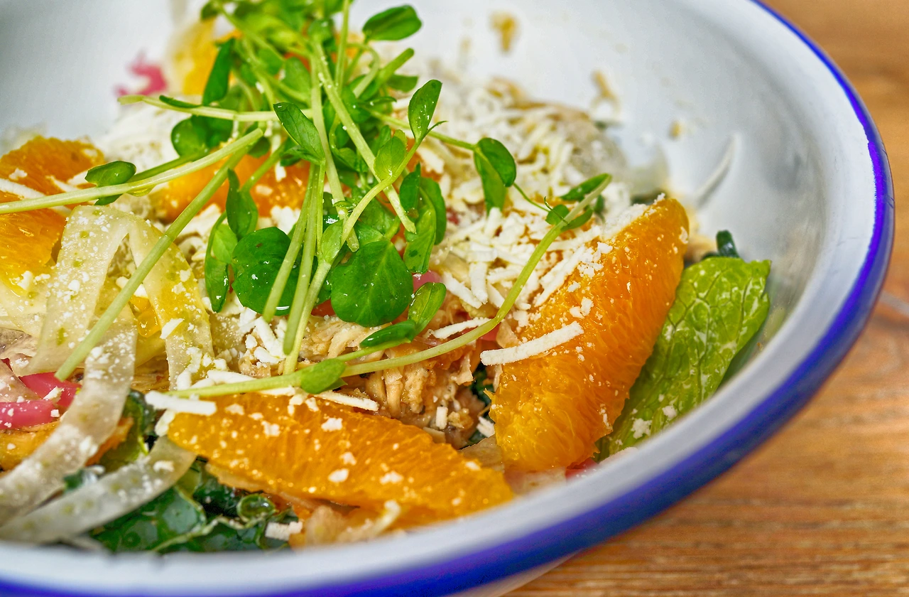 Chicken, "Reanch" Dressing, Fennel, Navel Orange, Pickled Red Onion, Pea Shoots, Mizithra Cheese