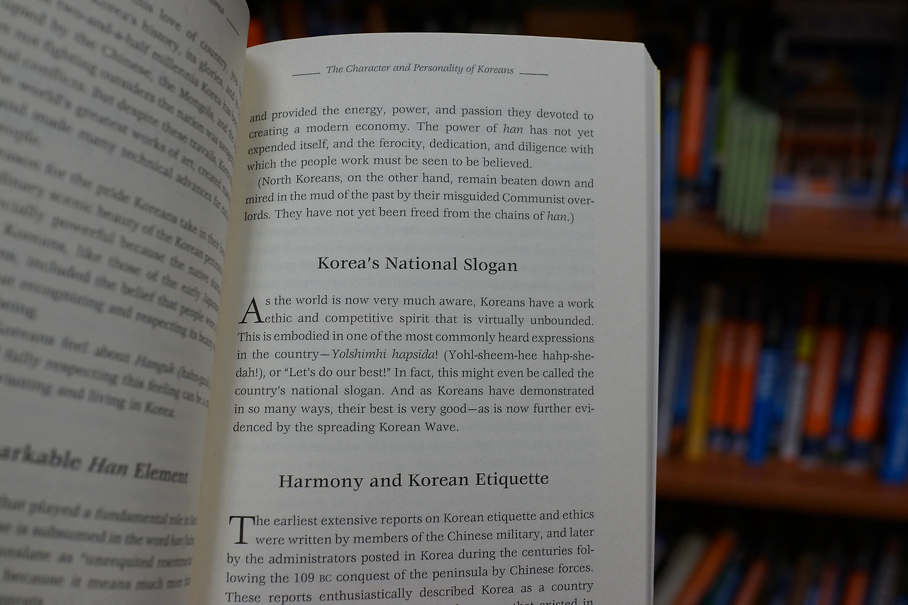 그중에서 ‘한국의 국가적 슬로건(Korea’s National Slogan)’이라는 소제목이 있길래 이게 뭔가 궁금해서 읽어봤더니, 한국에서는 ‘열심히 합시다!’라는 범 국민적인 슬로건이 있다는 것이다. 물론 열심히 하는 사람들이 많은 것은 사실이지만, 이게 국가적 구호였다니 적어도 나는 몰랐다. 그래도, 이 책을 읽은 사람들은 ‘한국인들은 무슨 일이든 열심히 하는 사람들이야.’한다면 나쁜 일은 아닐 것 같긴 하다.