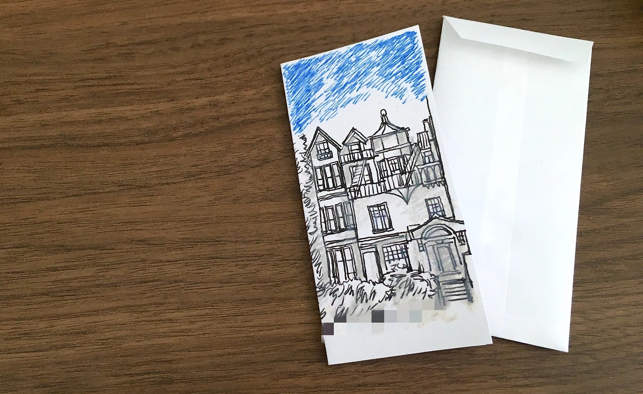 기회가 왔으니 샌프란시스코 거주민 답게 평생 처음 감사 카드나 써볼까. 어버이 날에도 안 쓰기 때문에 부모님께는 비밀로 해야 할 것 같다. 사러 나가기도 귀찮고 해서(사실 집 밖에 나가는 것이 무서워짐) 집에 있던 도화지에 우리 집을 슥슥 그려서 카드를 만들고, 남는 A4 용지로 봉투도 만들었다. 그리고는 열쇠 봉투에 함께 넣어 다시 주인집 PostBox에 밀어 넣어두었다. 이걸 보시고는,
