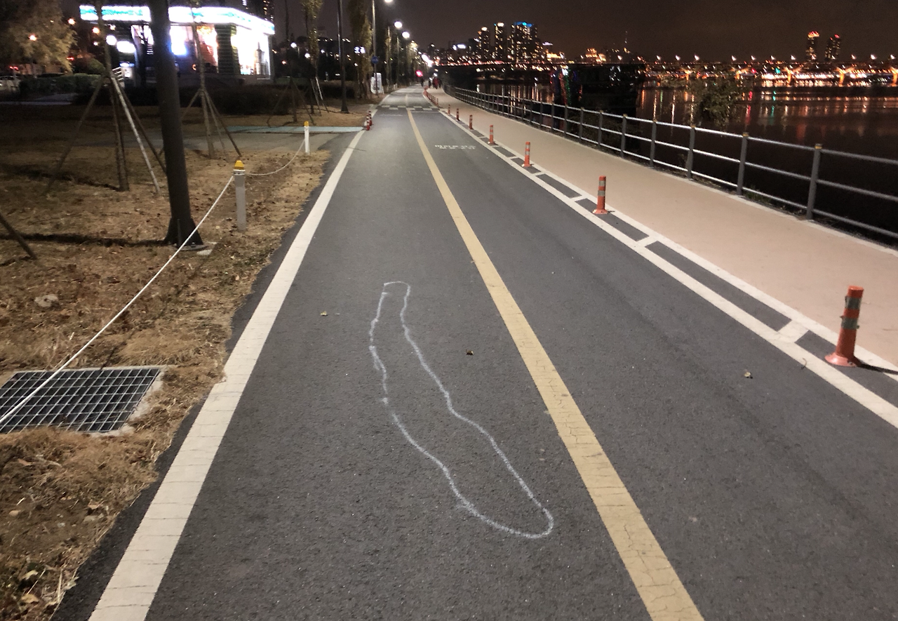 자전거를 타고 지날 때마다 보게 되는 한강 자전거 길의 사고 현장 페인트가 있다. 그런데, 그게 일반 사고 현장의 페인트 마킹과는 조금 다른데, 사람이라기에는 너무 길고(약 2.5미터) 폭도 상당히 좁다.