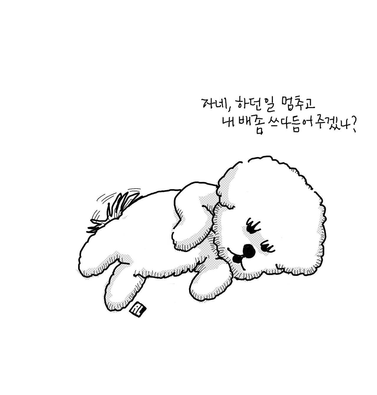 마중의 순서는 늘 같은데, 우선 내쪽으로 점프를 한두 번 해준다.(이때 짖기도 하는데, 나는 좋아서 짖는 것이라 생각하고 있다) 그리고는 숙인 내 얼굴의 콧잔등에 침을 좀 묻혀준 후, 배를 보여주는 의식이 진행된다. 이 작업은 먼저 몸의 무게중심을 한쪽으로 기울이는 것으로 시작하며, 이후 천천히 다리들을 몸통 안쪽으로 밀어 넣으며 등을 바닥에 굴리기 시작한다. 그런데, 그 작업이 엄청나게 천천히 진행되는 게 특징이다. 매번 그 장면을 볼 때마다, 아이폰으로 촬영한 데이비드 리치 감독의 눈싸움 광고에서 주인공이 마지막 일격을 날리는 장면이 생각날 정도다. 아이폰의 슬로비디오 촬영 기능은 최고지만, 우리 강아지의 배 뒤집는 작업을 촬영할 때만큼은 그다지 쓸모가 없다고 생각한다. 어쨌든, 준비가 되면 나는 배를 쓰다듬기 시작하는데, 그때 나를 보는 눈빛이 딱 이렇게 말하는 것 같다는 거.